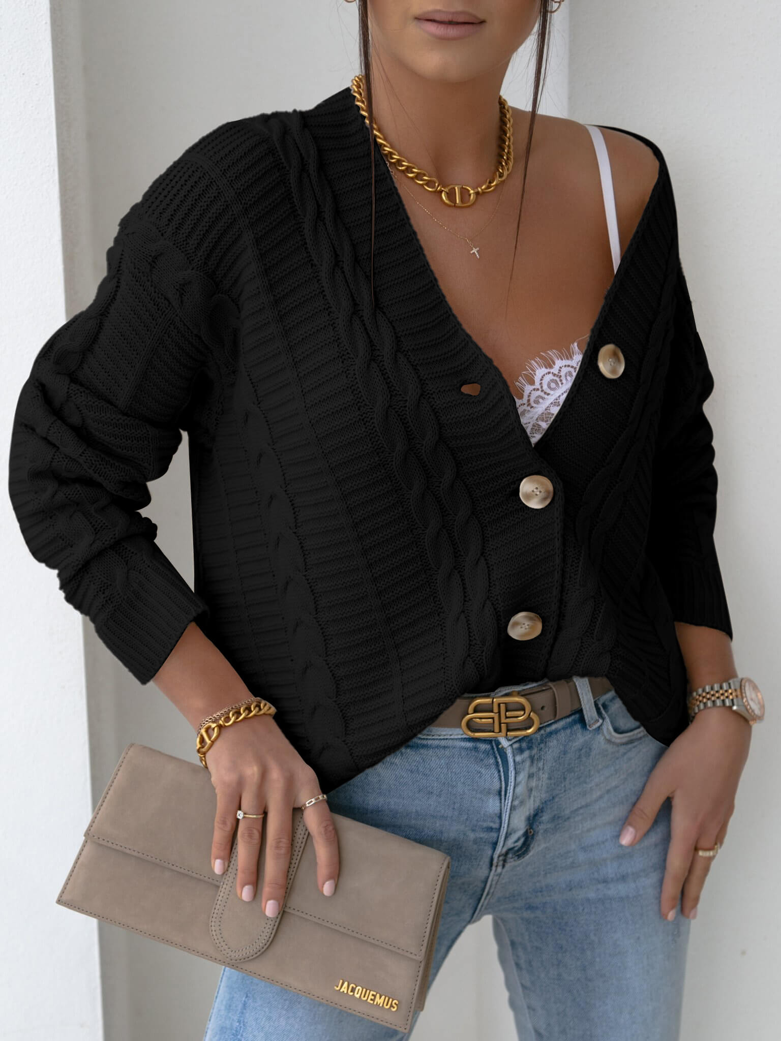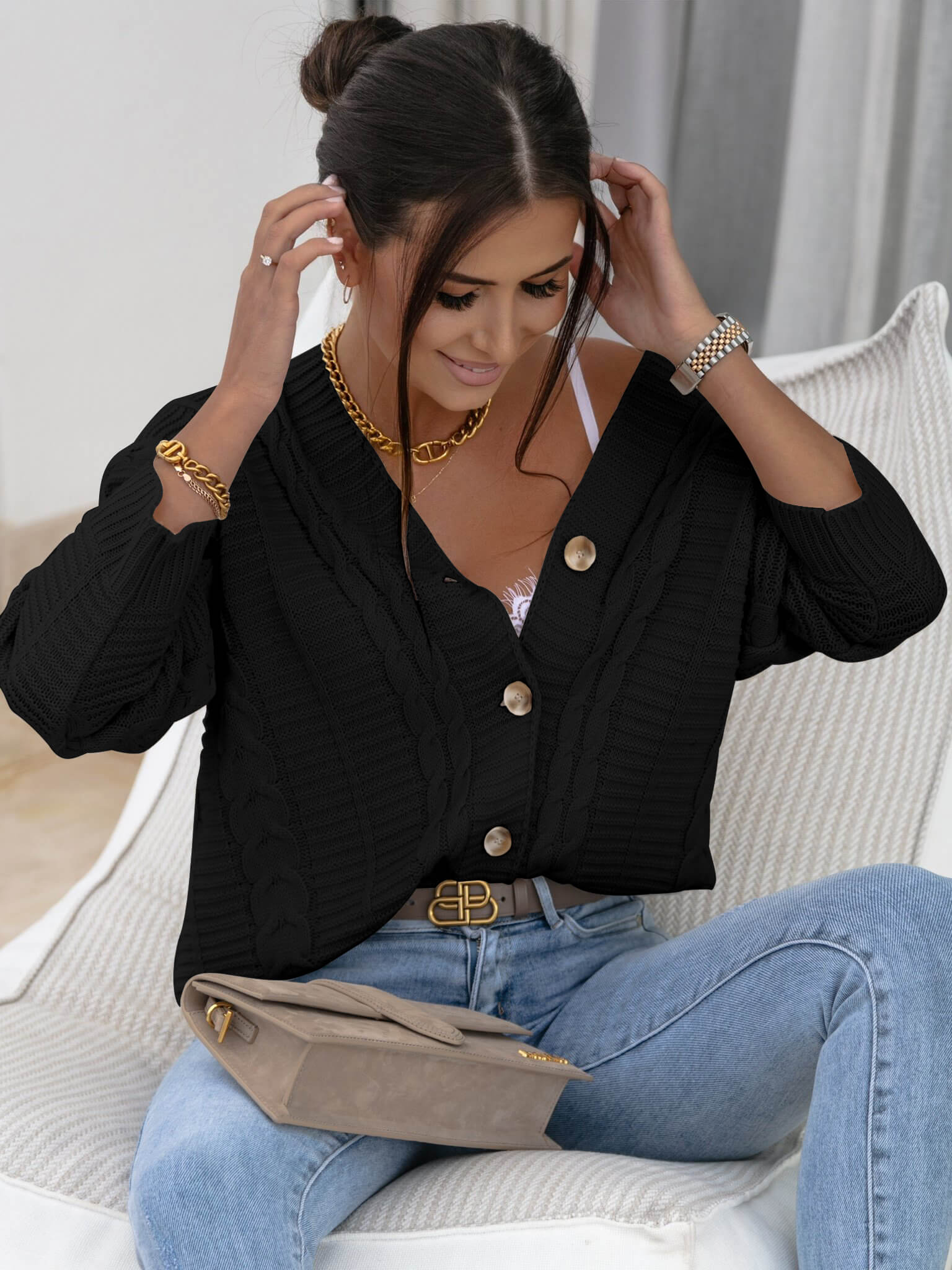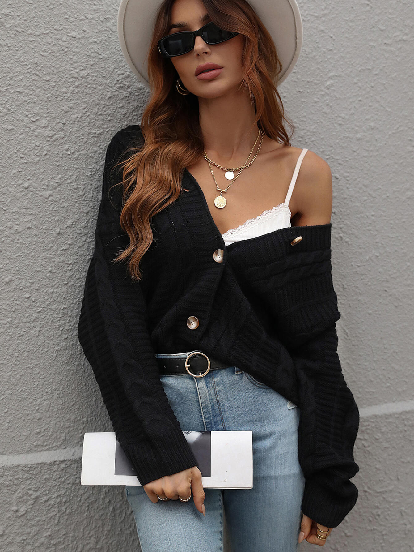 - Feature: Longrelaxed sleeves. Centre-front functional buttons. Wide v-neckline. Rib knit pattern on fabric.
