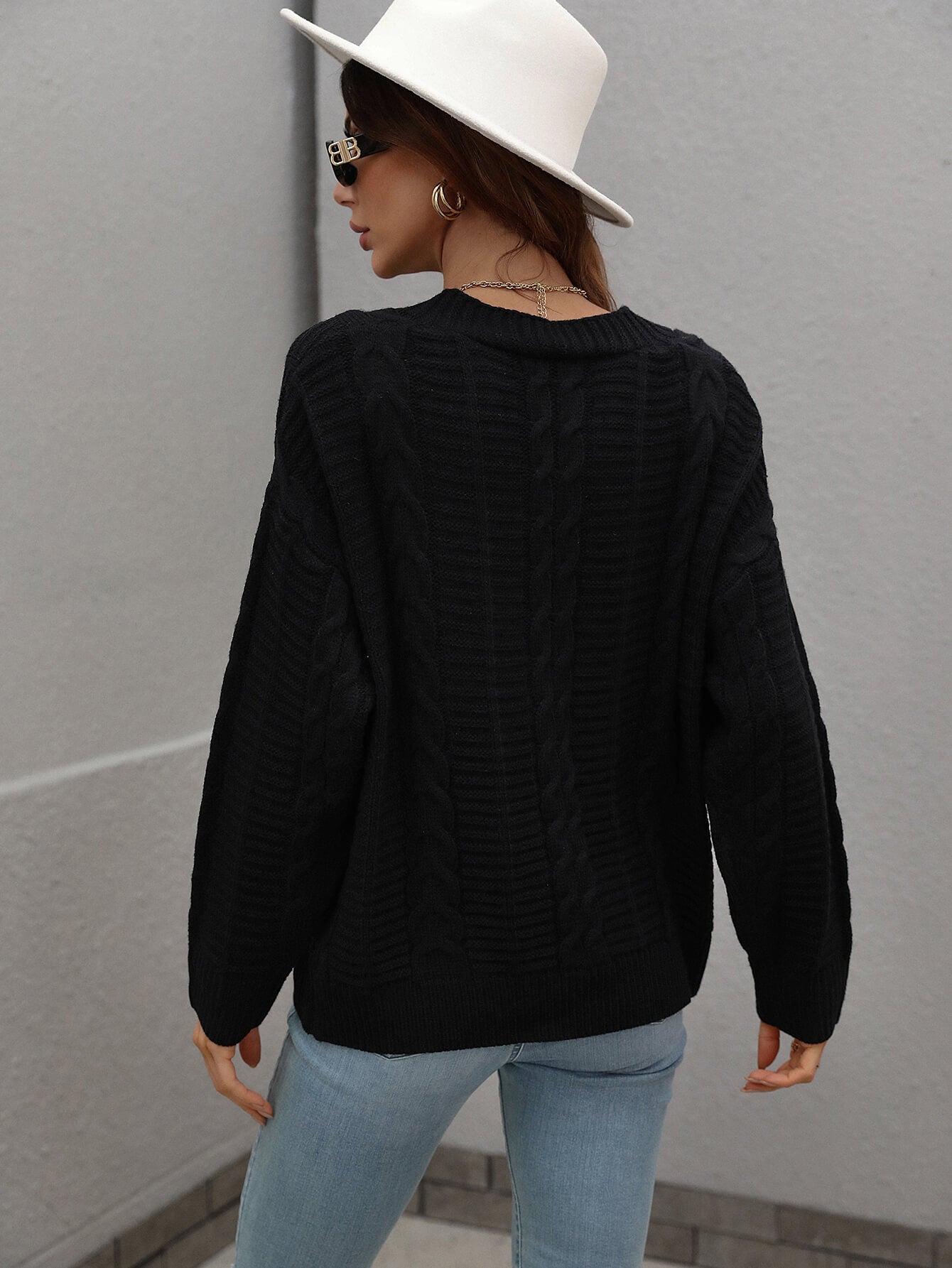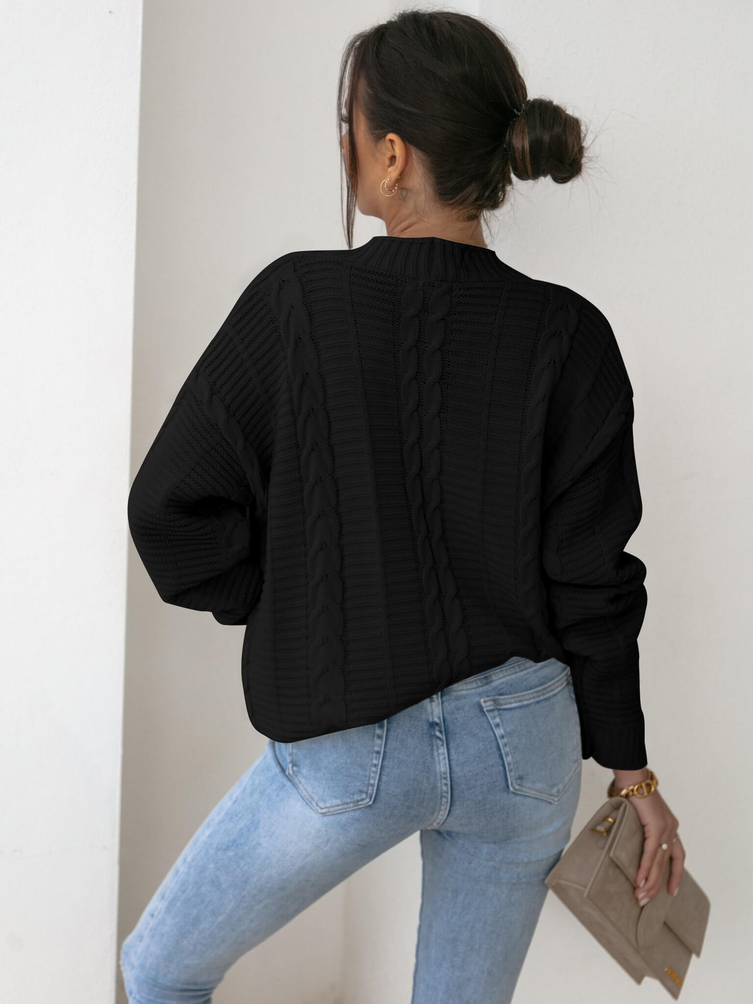 Our Rachael Cardigan comes in a solid blacktone. This chunky cardi features a V neckline, buttons down the centre of the front, ribbed cuffs and hem. This classic silhouette and tone is perfect for the cooler weather ahead. The fun patterns all over are great for pairing withour luxe leather boots!