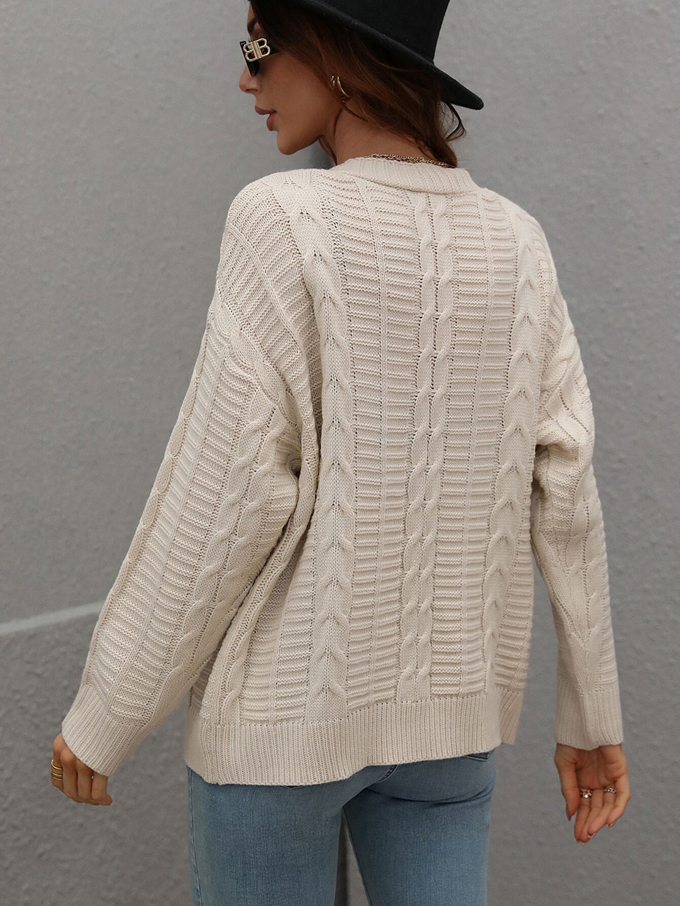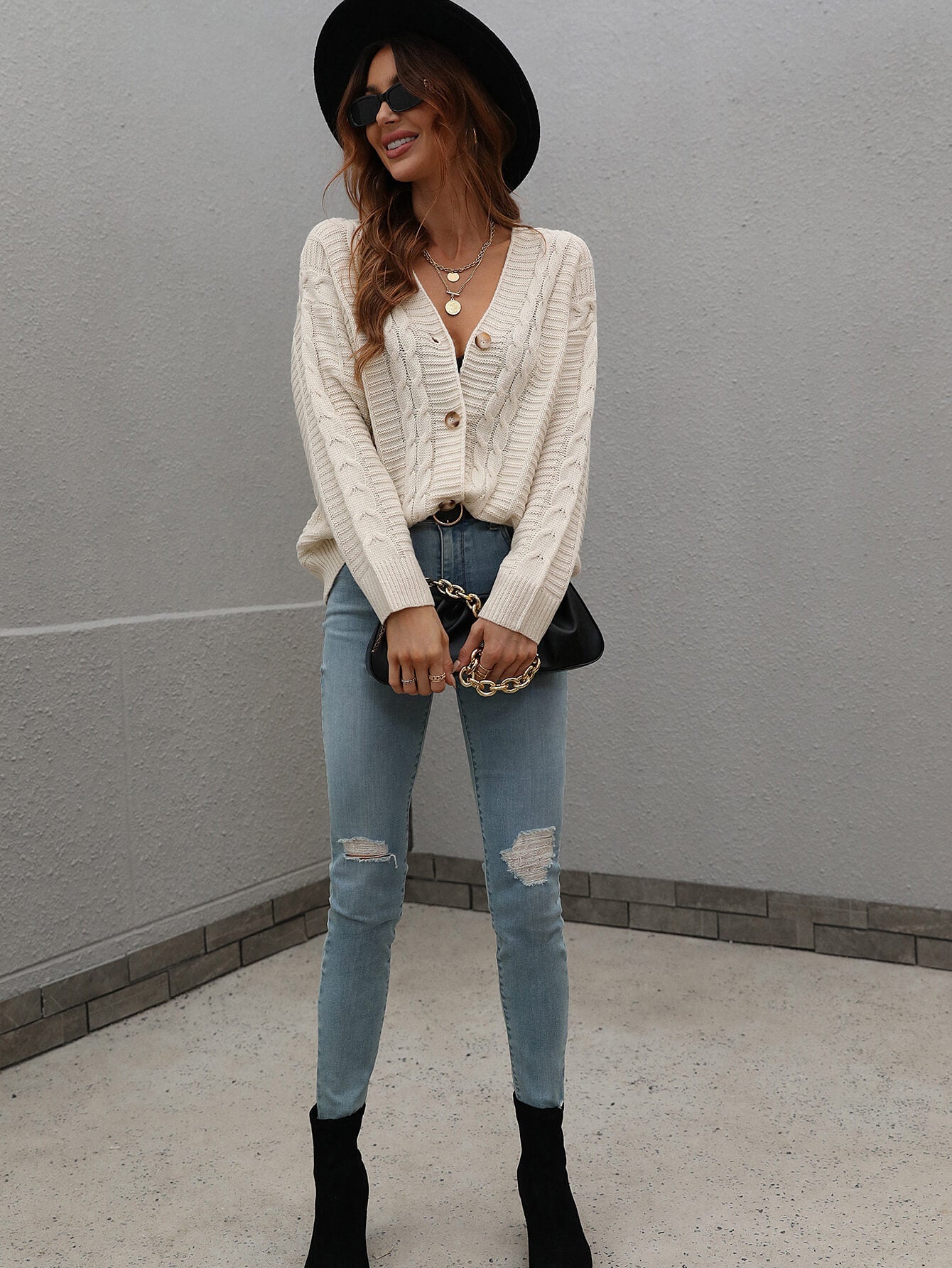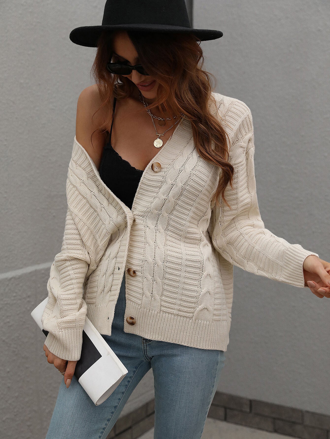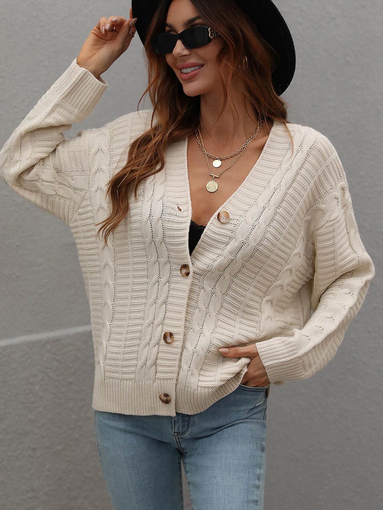 - Feature: Longrelaxed sleeves. Centre-front functional buttons. Wide v-neckline. Rib knit pattern on fabric.