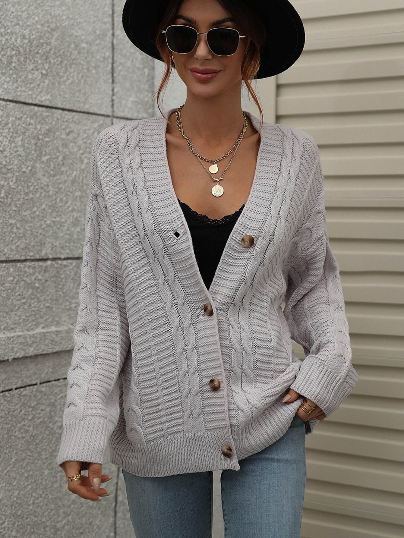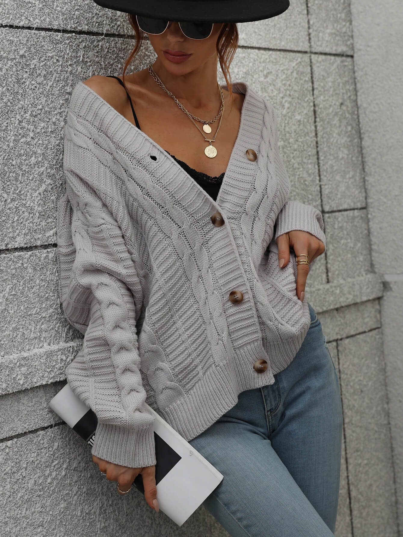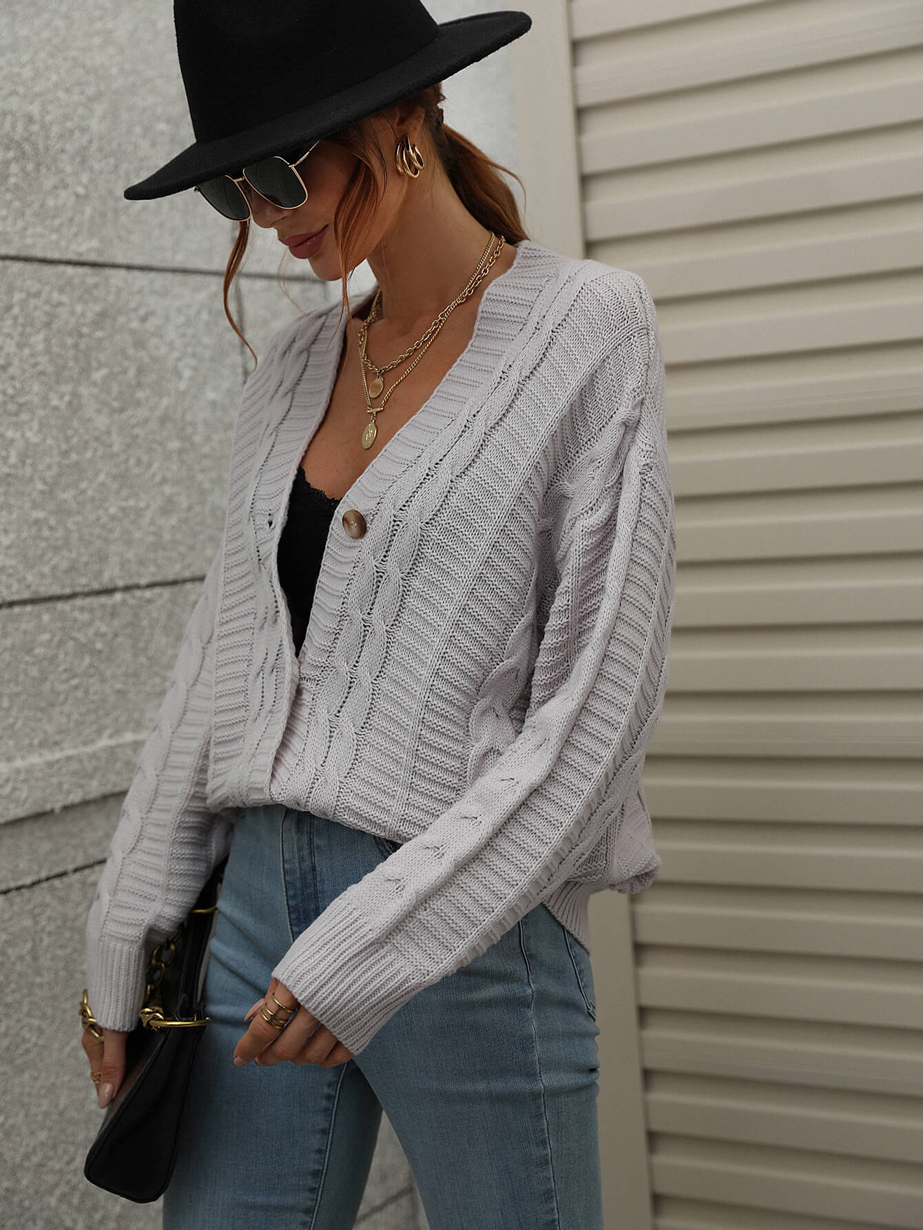 - Feature: Longrelaxed sleeves. Centre-front functional buttons. Wide v-neckline. Rib knit pattern on fabric.