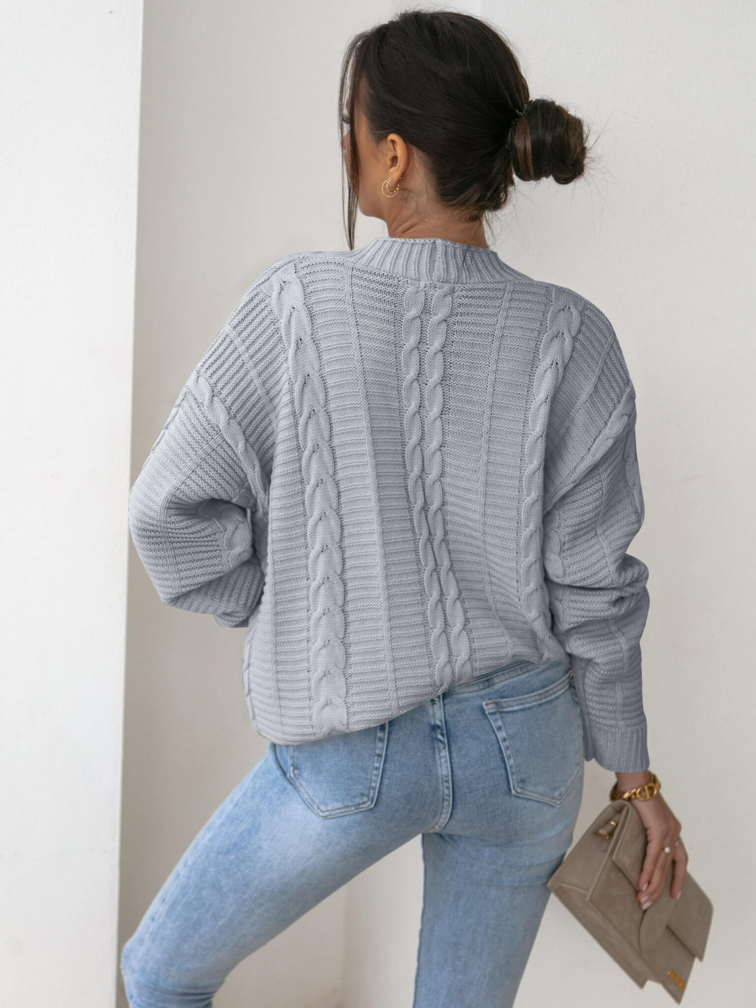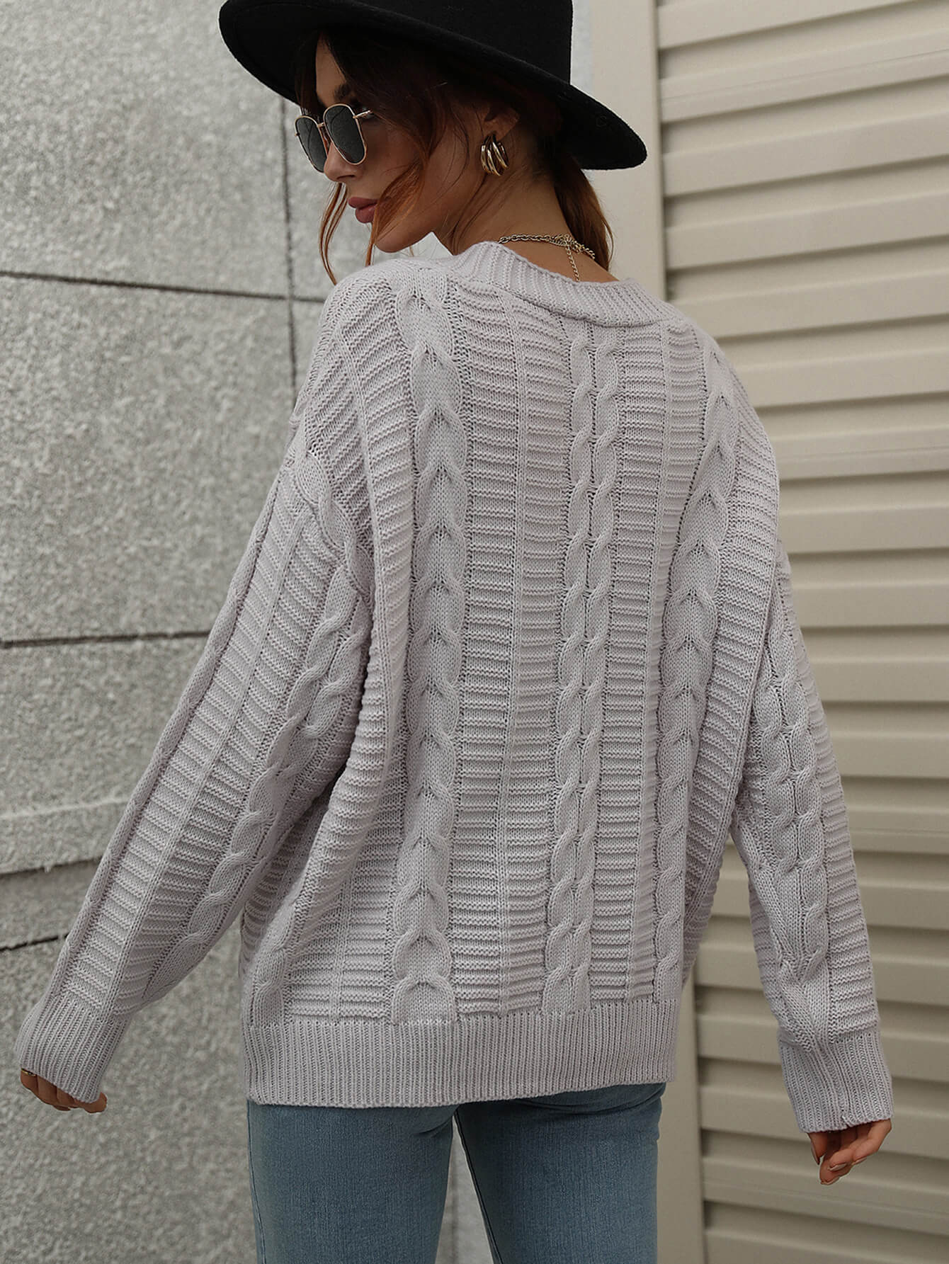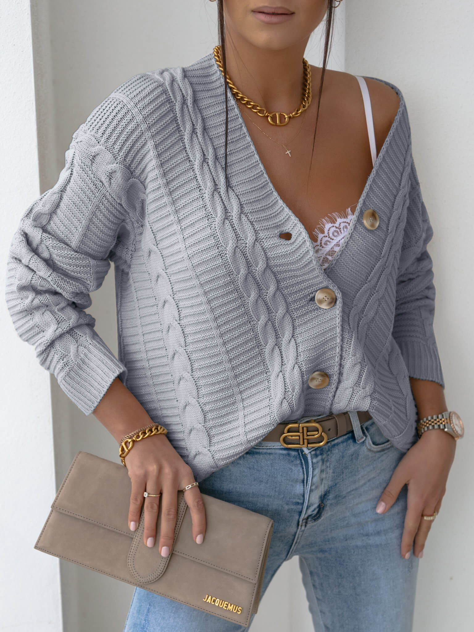 - Feature: Longrelaxed sleeves. Centre-front functional buttons. Wide v-neckline. Rib knit pattern on fabric.