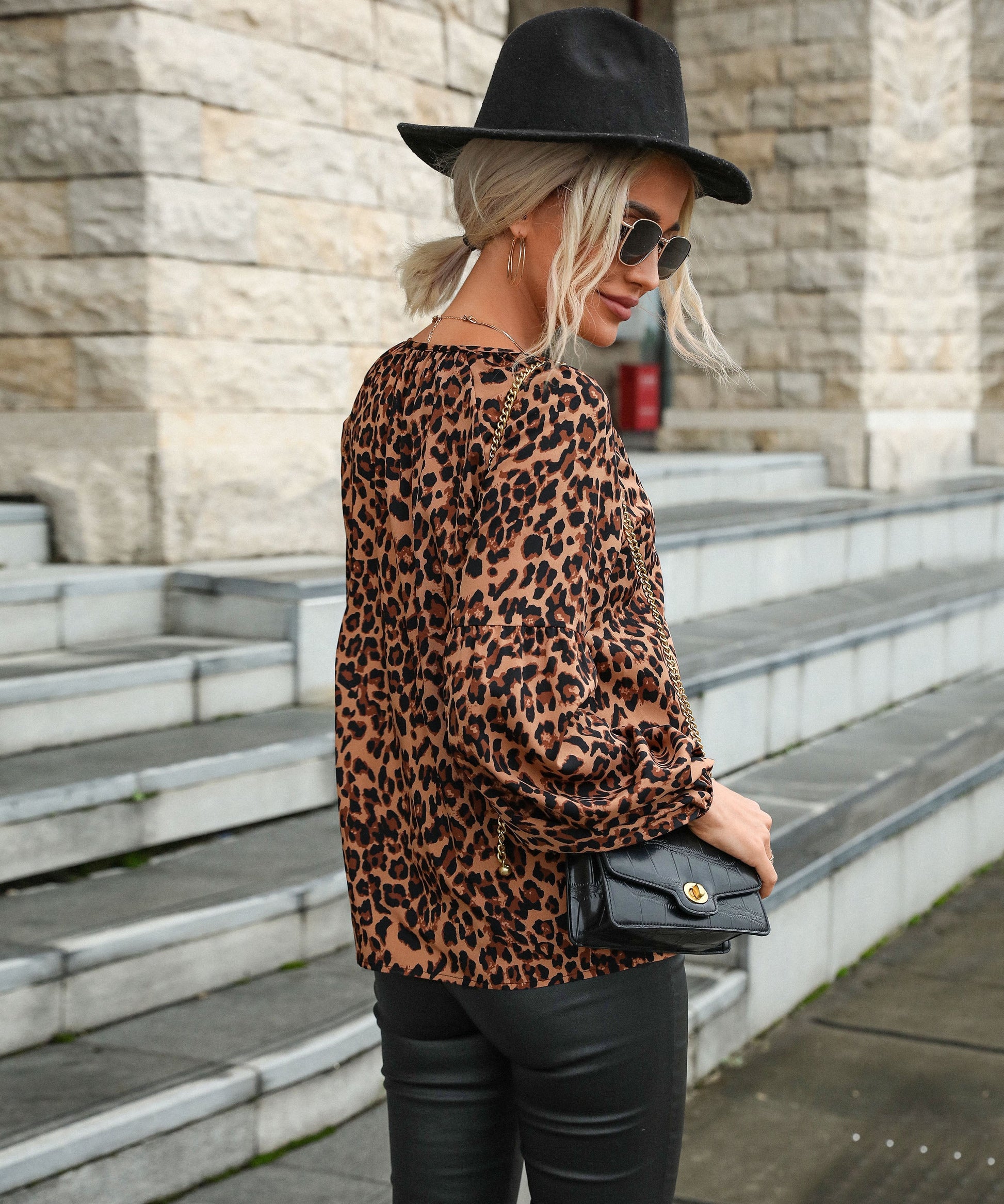 Our Ratten Top top is a fun brown & black animal print. It's a gorgeous lightweight material in a relaxed shapeand v neckline. The balloon long sleeves are cinched at the cuffs for practicality making this a fun everyday blouse.