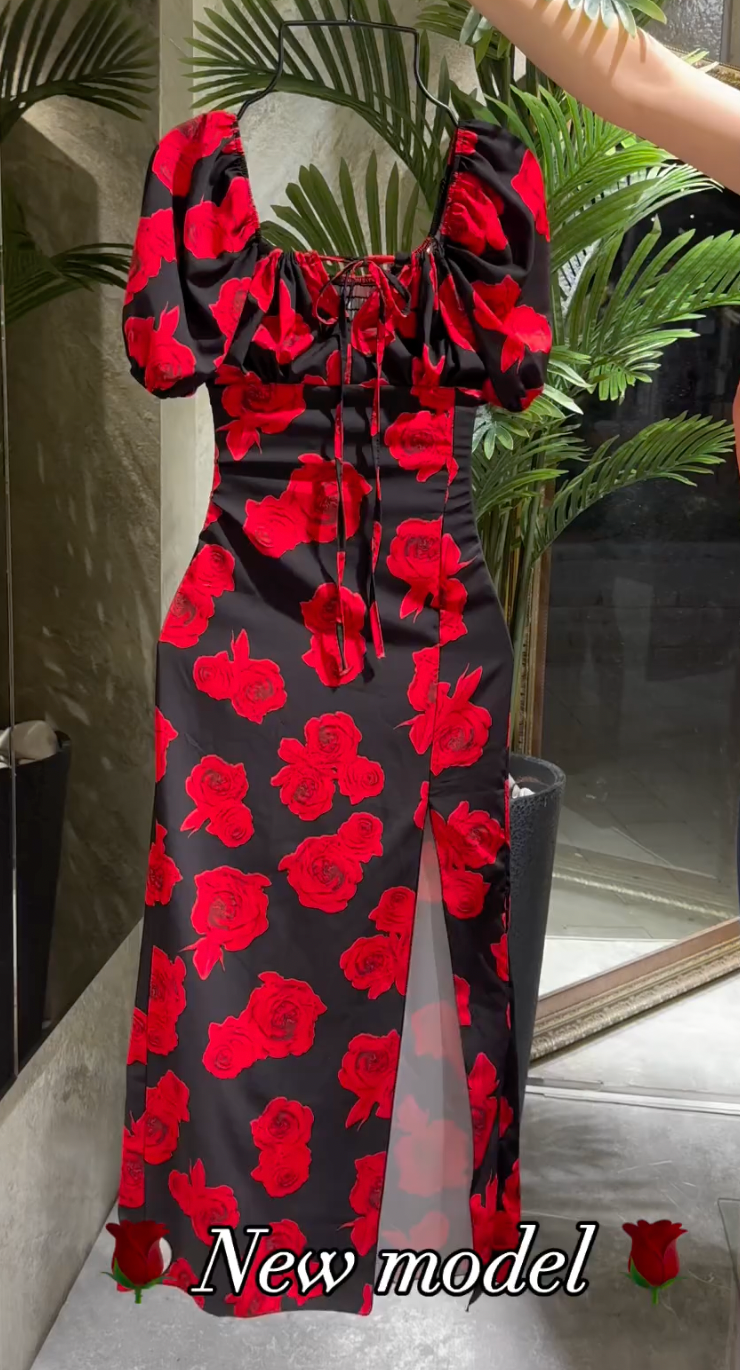 Red Rose Floral Print Midi Dress