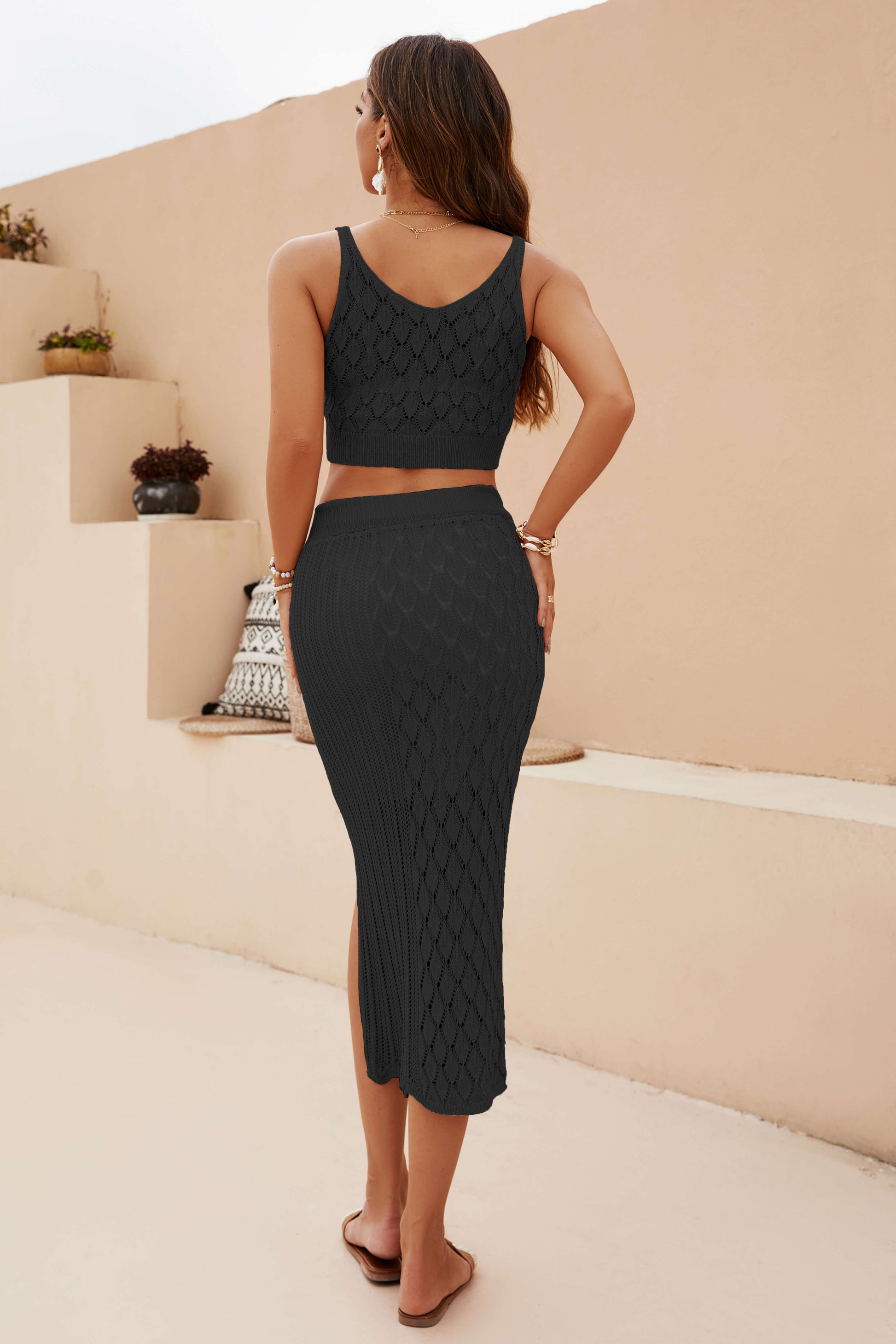- Key Features:WideVNeckline. Pull-on. Crochet Knit Fabrication. 2 pcs Matching Set (1 pcs top & 1 pcs skirts). Relax Fit.