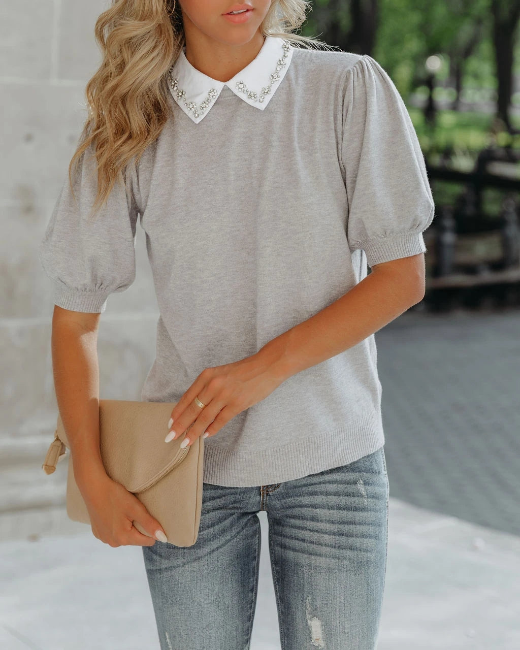- Feature: Relaxed fit. Rhinestone collar. Shortsleeve