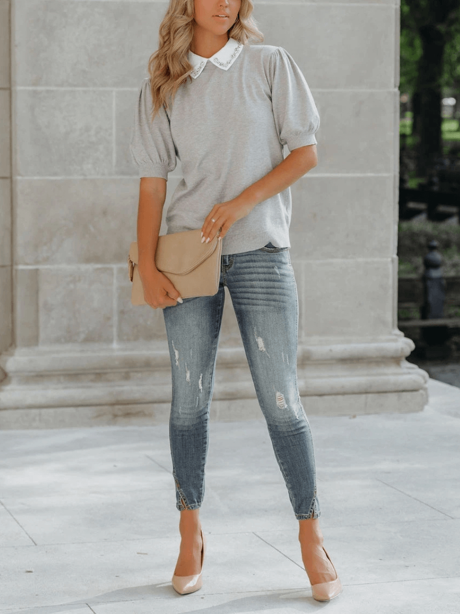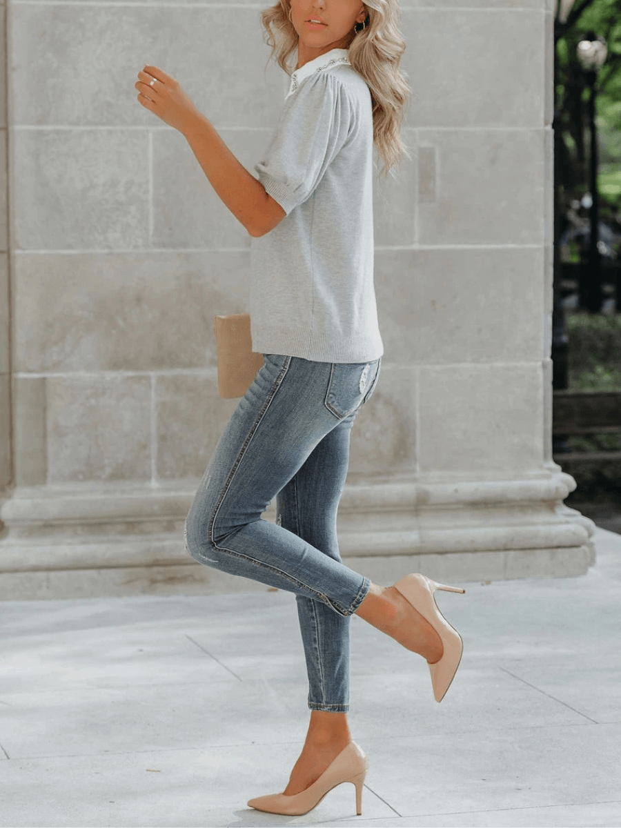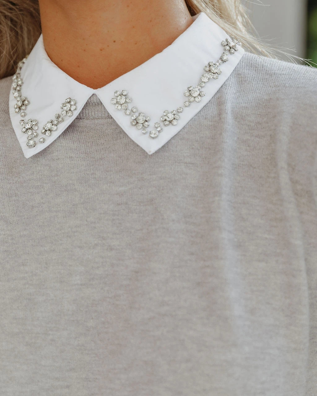 Ourrhinestone collarKnit Top comes insmoke grey tone. You can never have too much knitwear, especially when we are transitioning through to early fall. Thisknit topis perfect pairs with ourlatest luxue pumpcollectionto complete the look!