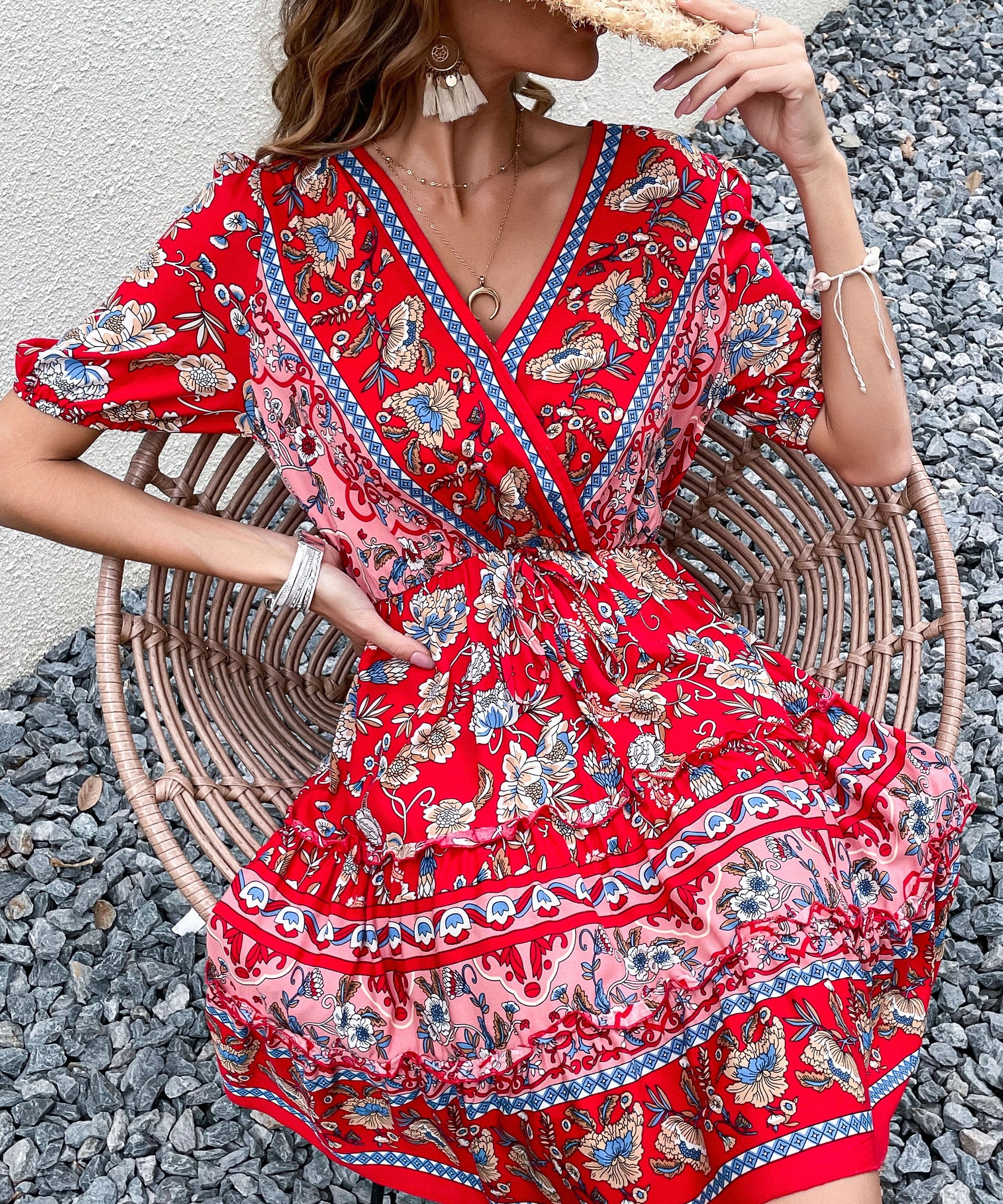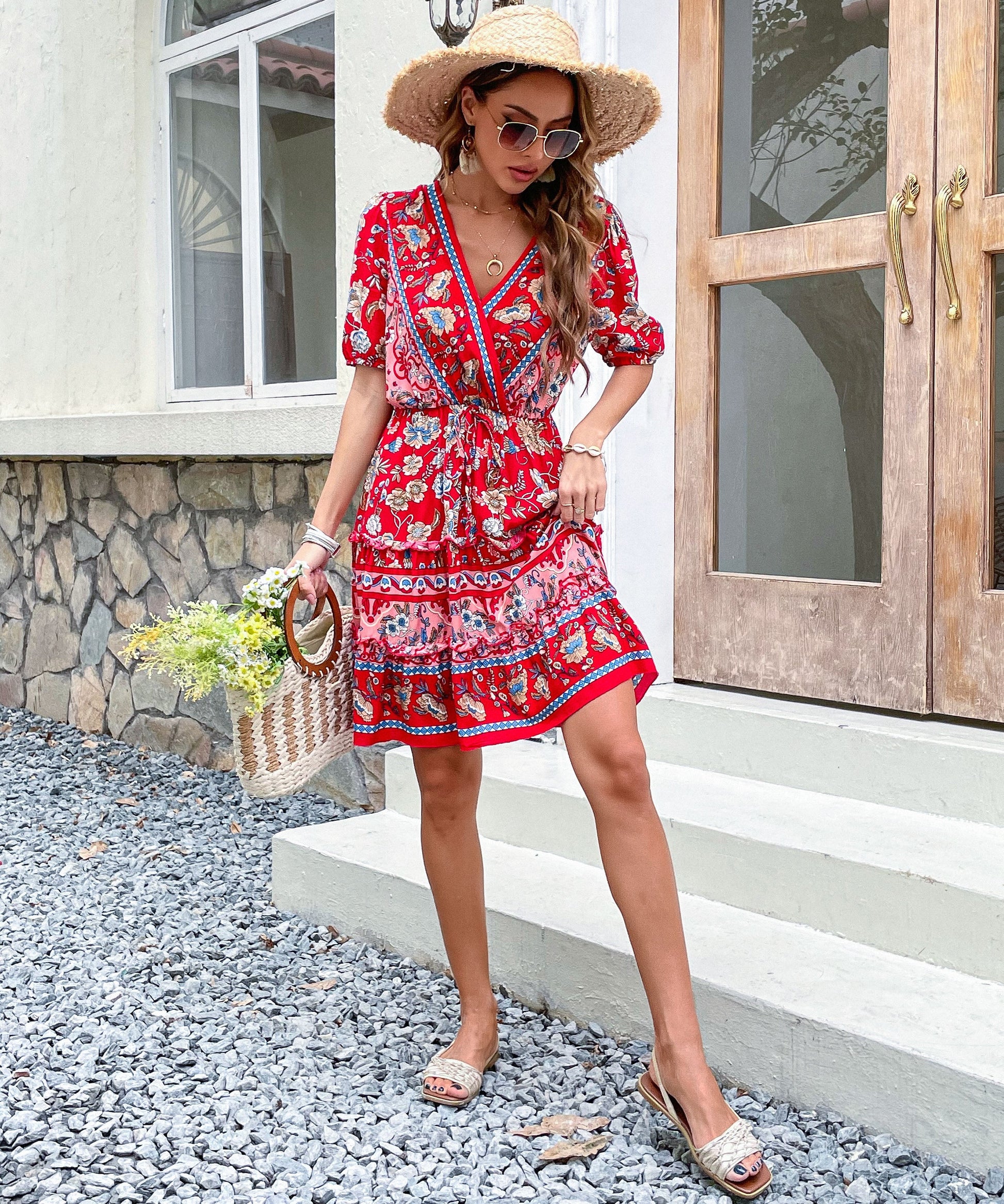 Our Ricarda Dress features ared base with purple and blush-toned prints. It's a gorgeous lightweight material ideal in a relaxed mini dress silhouette that is perfect for days spent in the sunshine. The V neckline is making this ideal for breastfeeding. Paired perfectly with our signature sandals, this midi makes for a stunningsummer seasonal piece!