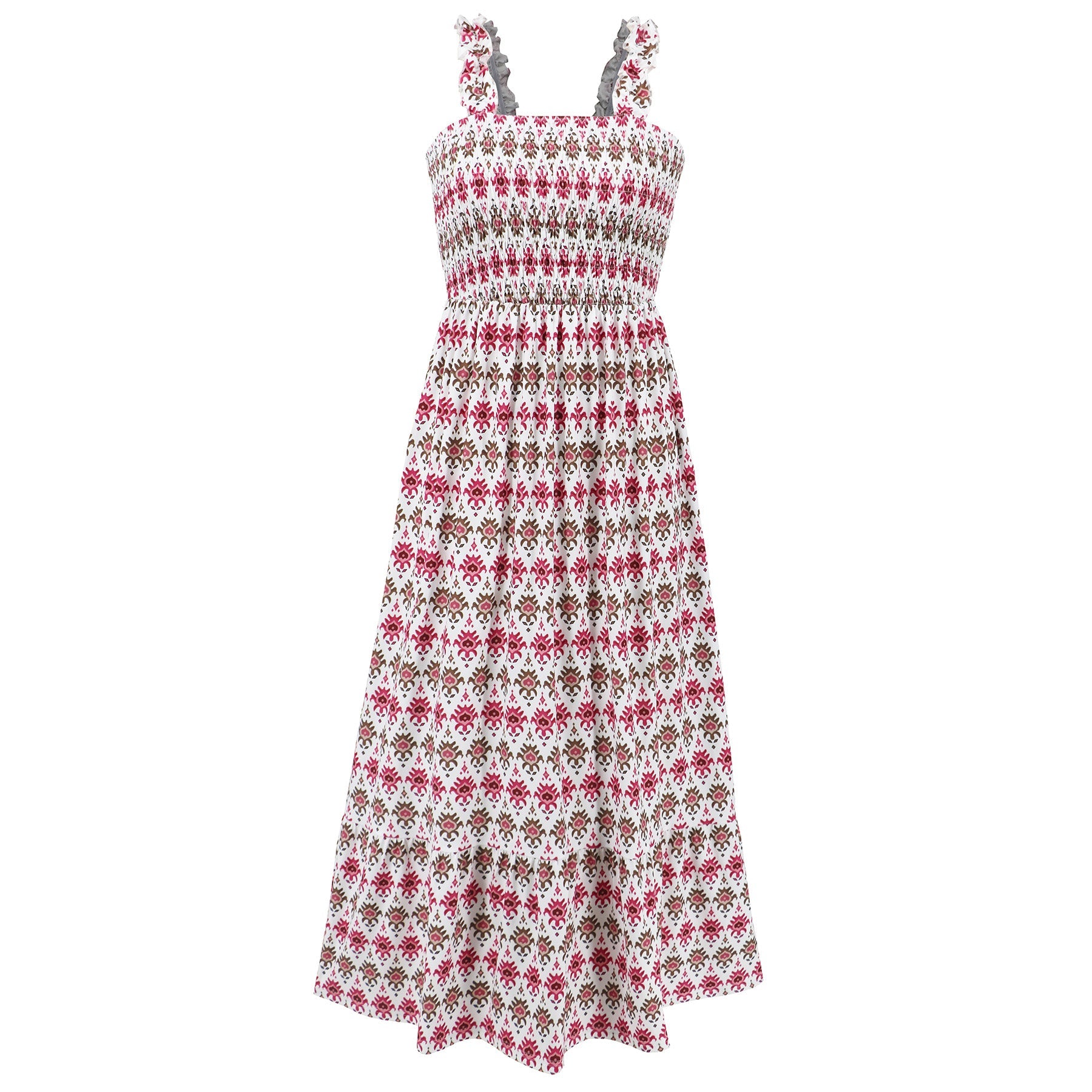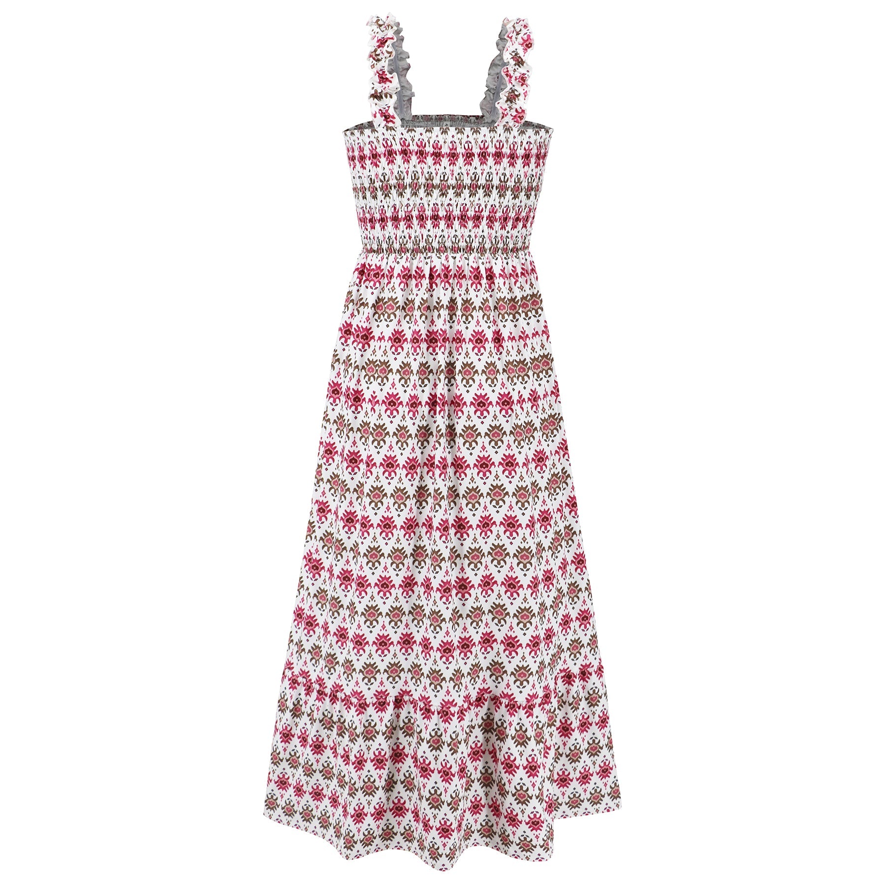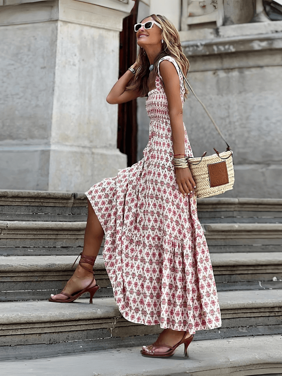 - Feature: Straight neckline. Sleeveless. Smocked bust. Maxi length. Flowy fit. No closures.