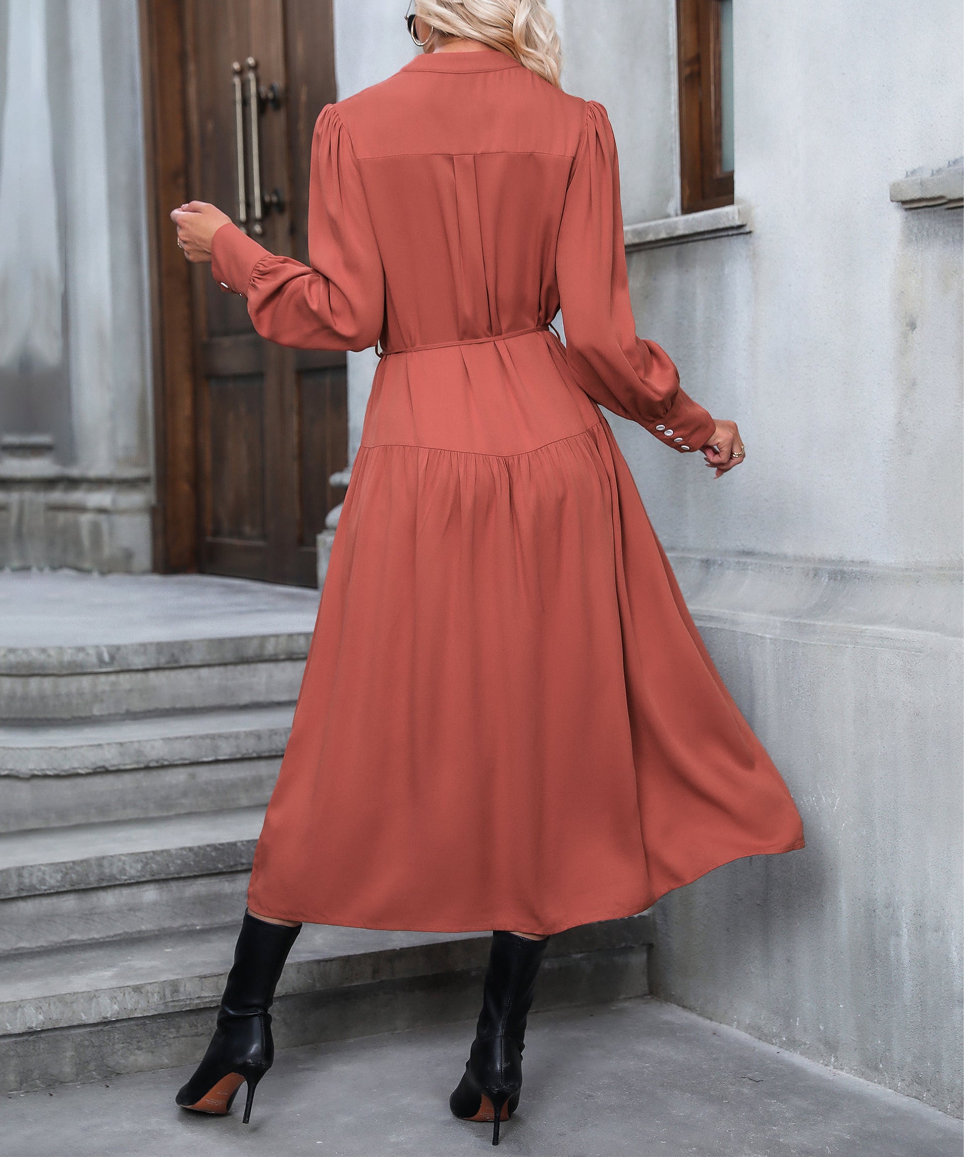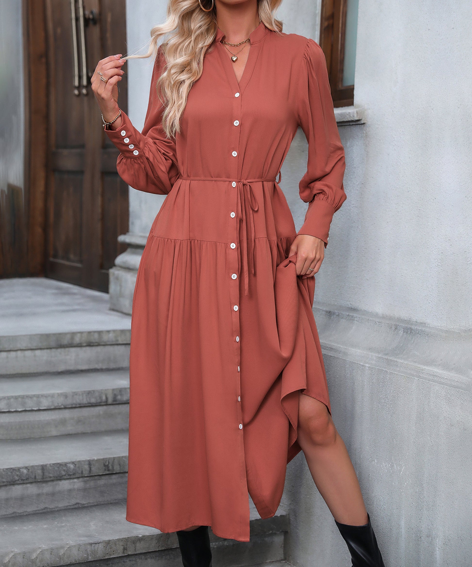 Serengeti Tie Waist Button Front Midi Dress - Rust