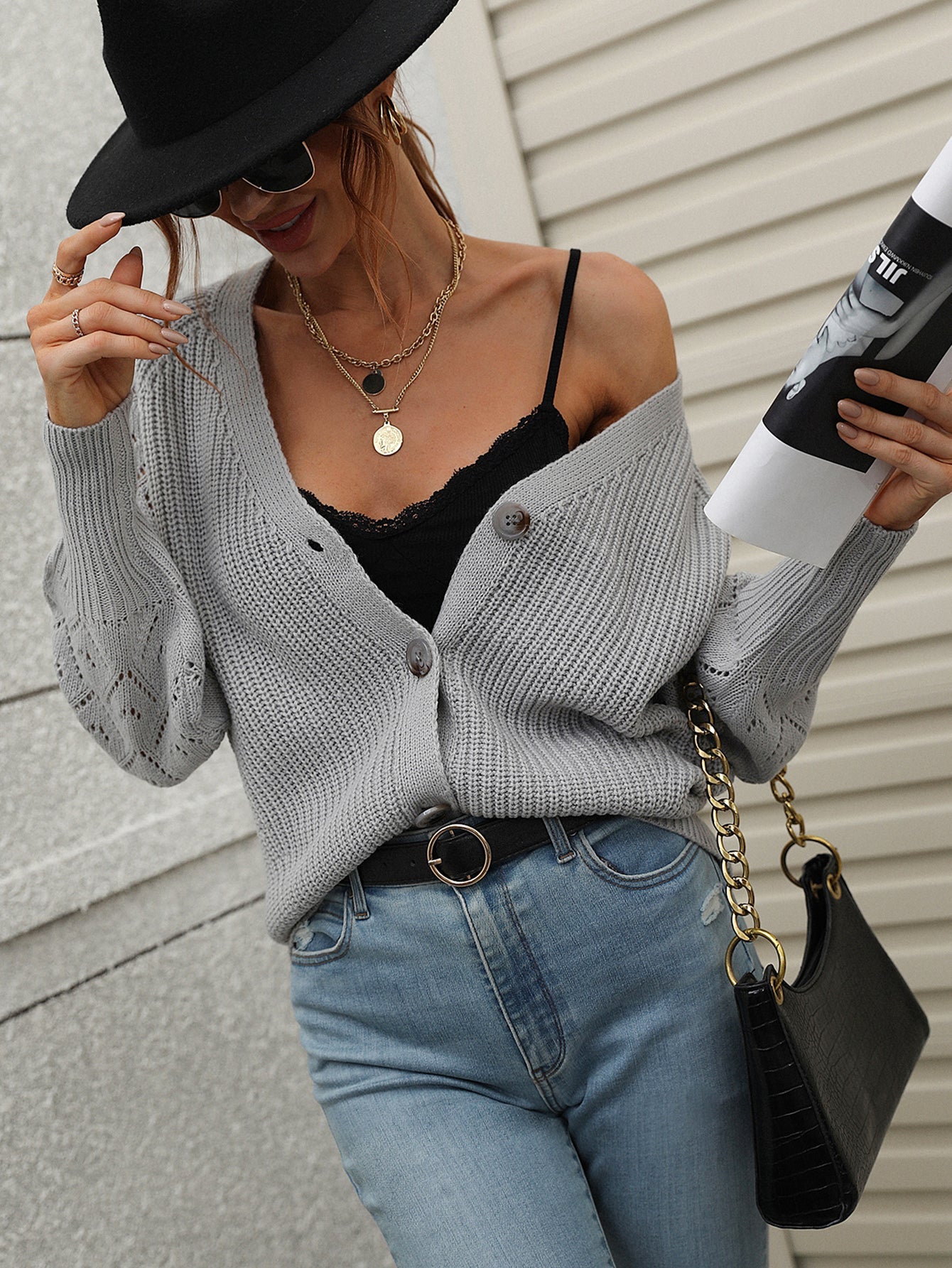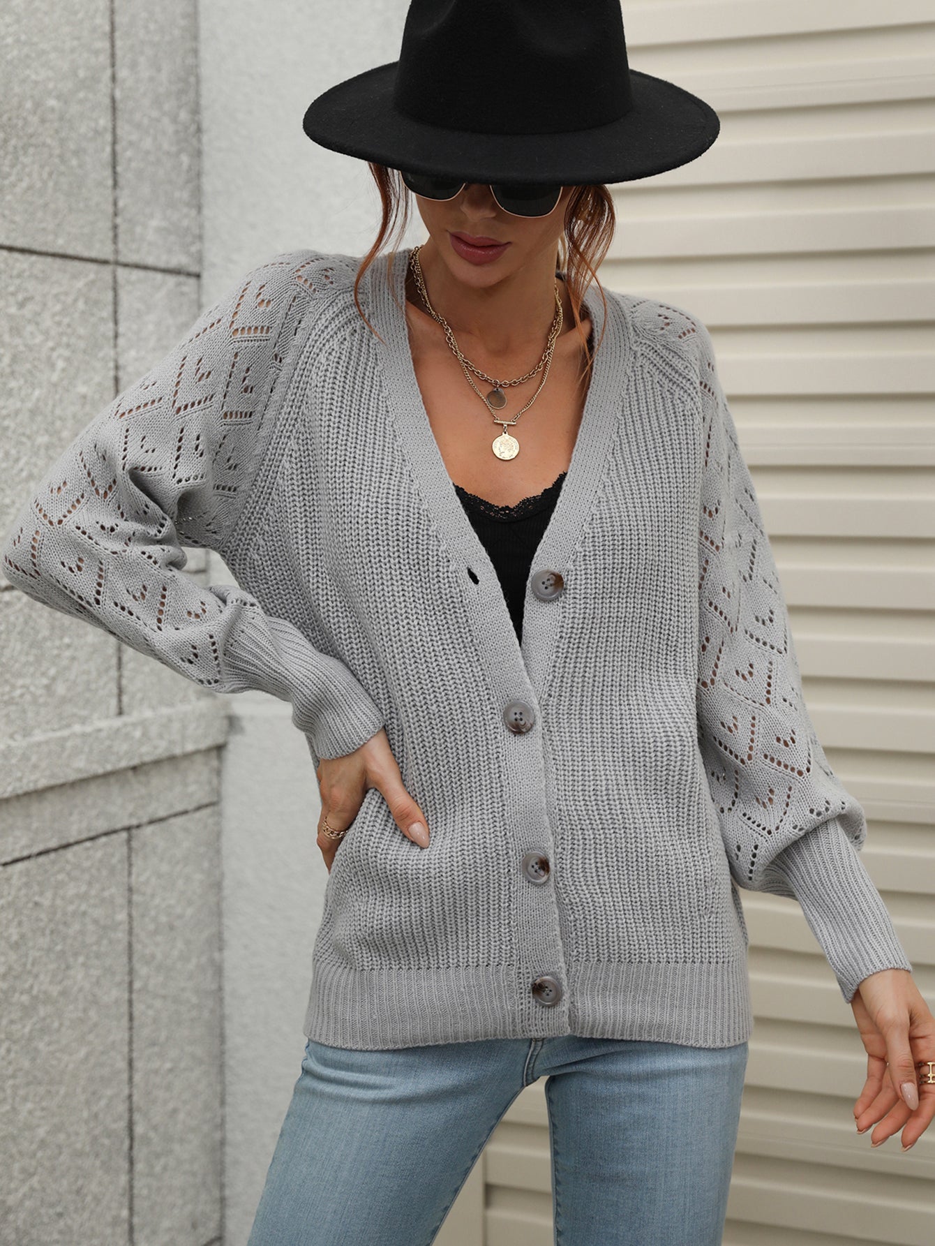 - Feature: Longrelaxed sleeves. Centre-front functional buttons. Wide v-neckline. Rib knit pattern on fabric