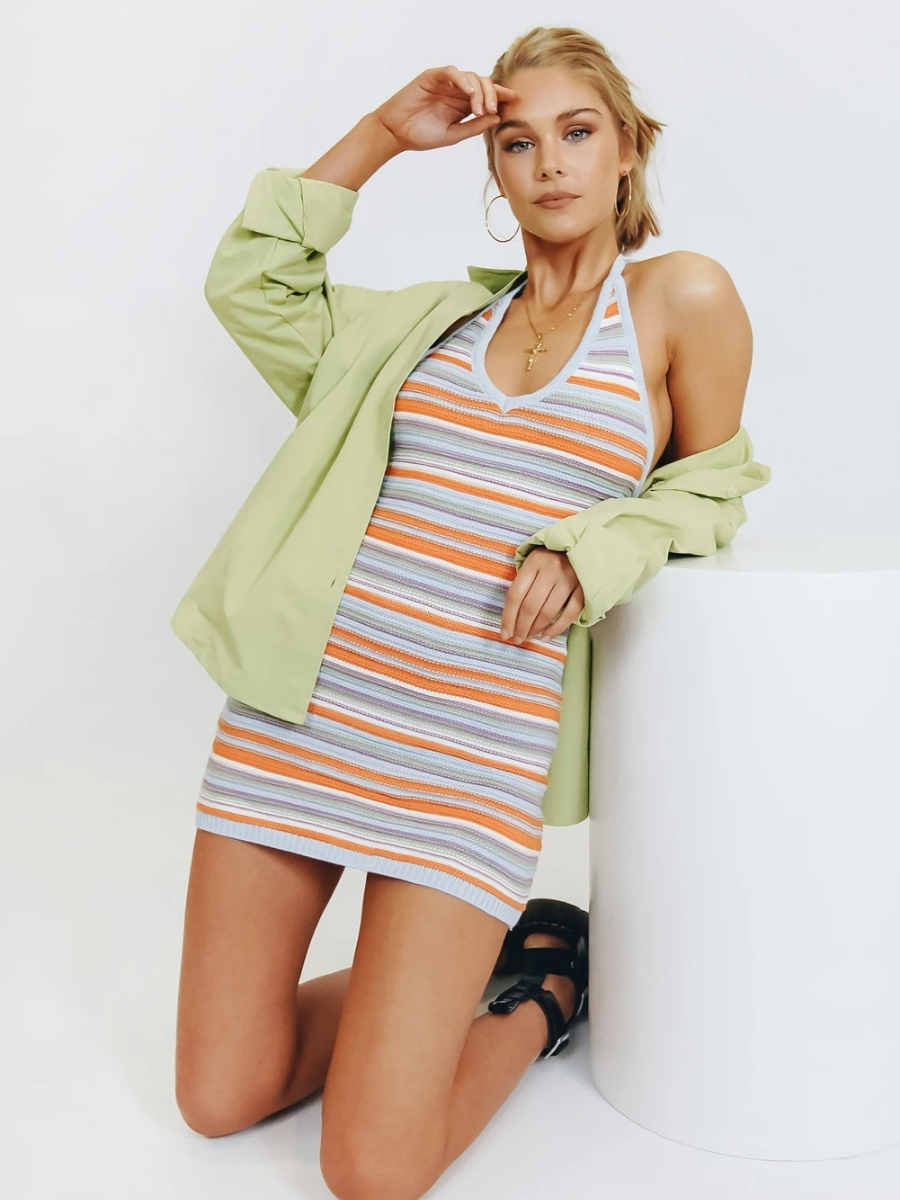 Our Shiela Knit Dress comes in playful colours of orange, pink and blue. Echoes of stripe patterns traveling down this knit textile that features a v neck, dress it up with our latest strappy sandal collectionas a stylishsummer look.