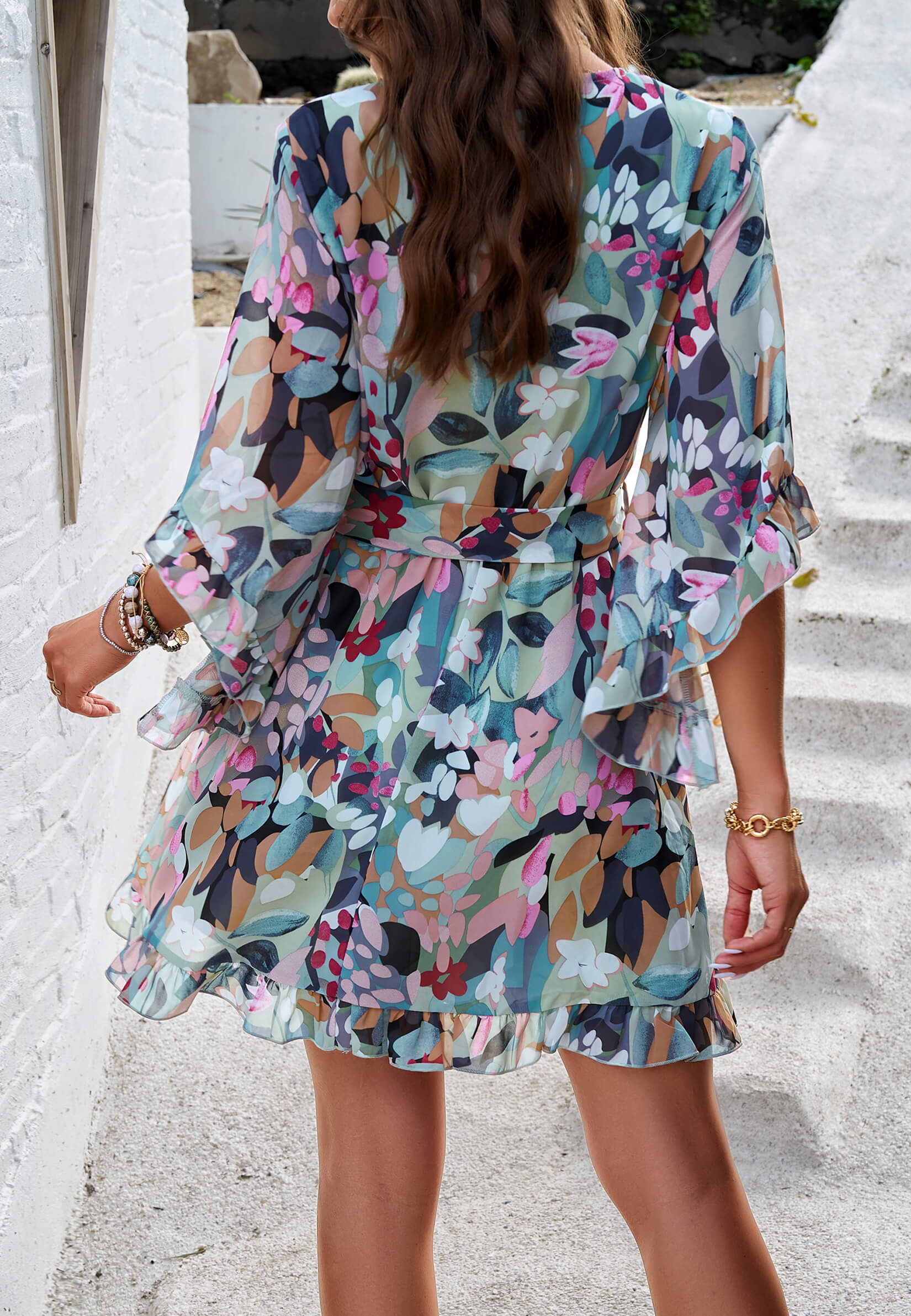 - Feature: V-Neckline. Wrap front with waist tie. Short ruffle sleeves. Floral Print. Chiffon Fabrication. Mini length.