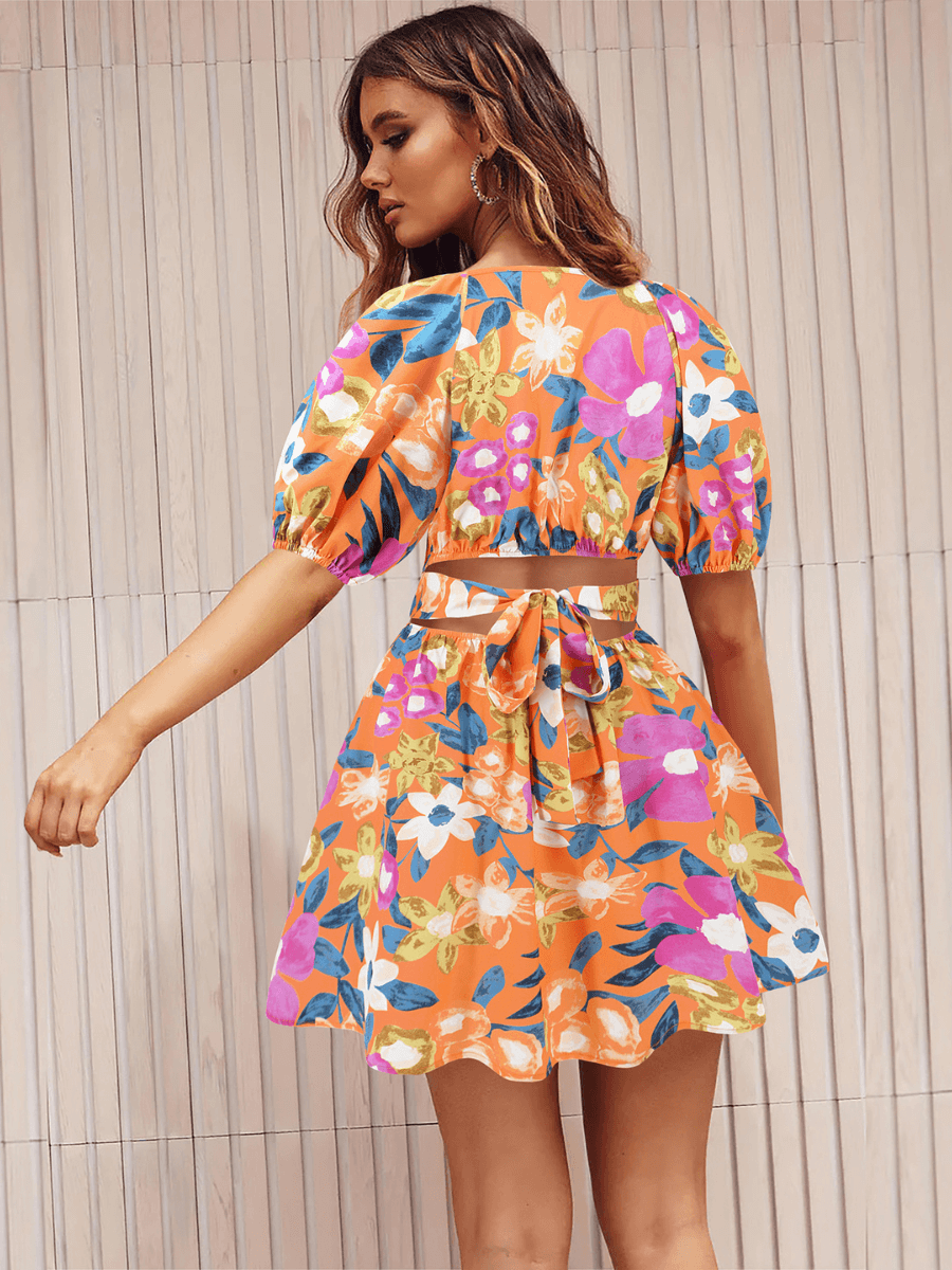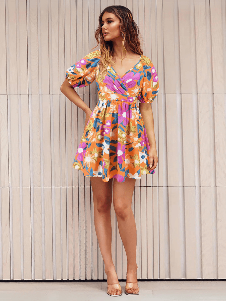 - Feature: V-neckline. Short Puff Sleeves. Wrap dress. Back Cut-out with tie bow. Floral print. Mini length. Relaxed fit. Not lined.