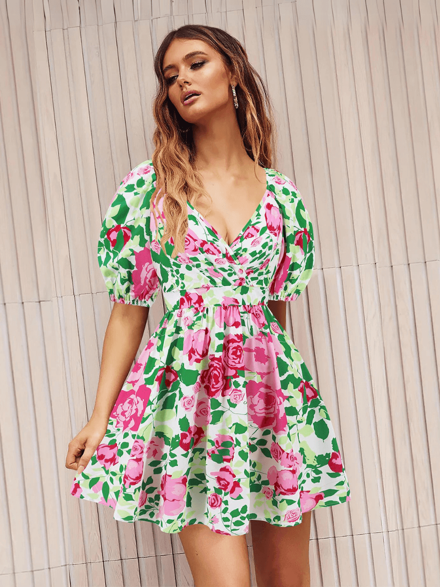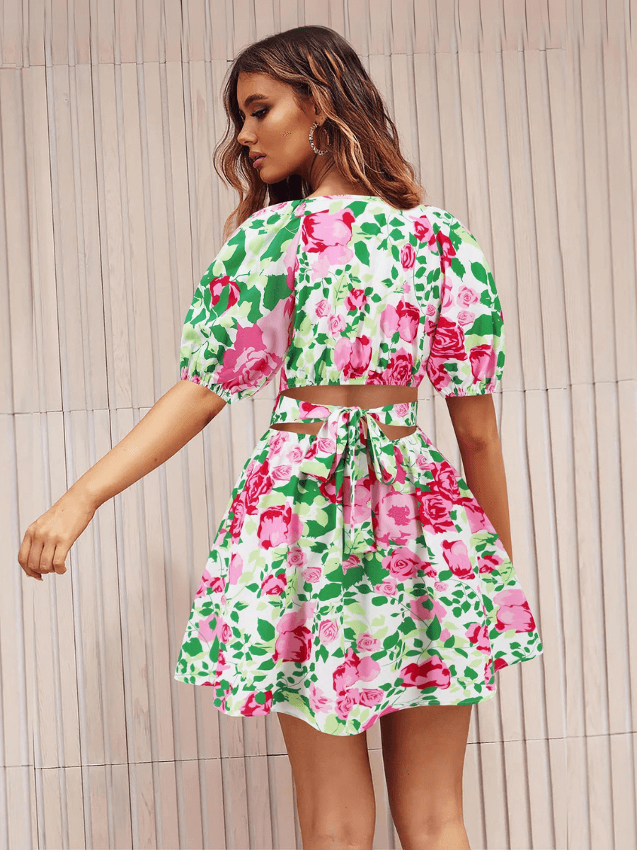 - Feature: V-neckline. Short Puff Sleeves. Wrap dress. Back Cut-out with tie bow. Floral print. Mini length. Relaxed fit. Not lined.