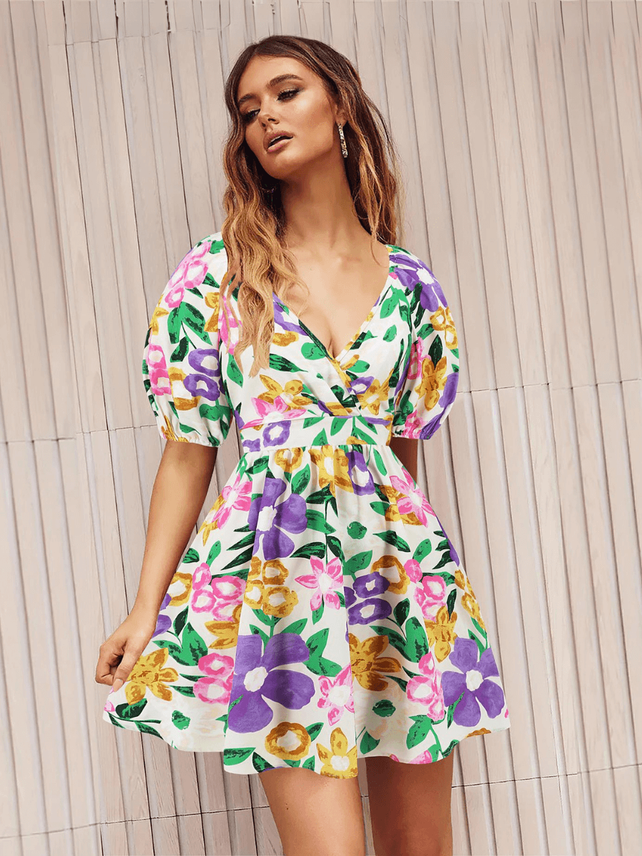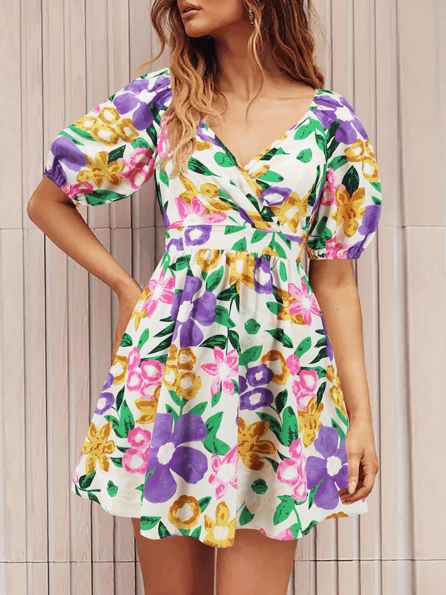 - Feature: V-neckline. Short Puff Sleeves. Wrap dress. Back Cut-out with tie bow. Floral print. Mini length. Relaxed fit. Not lined.