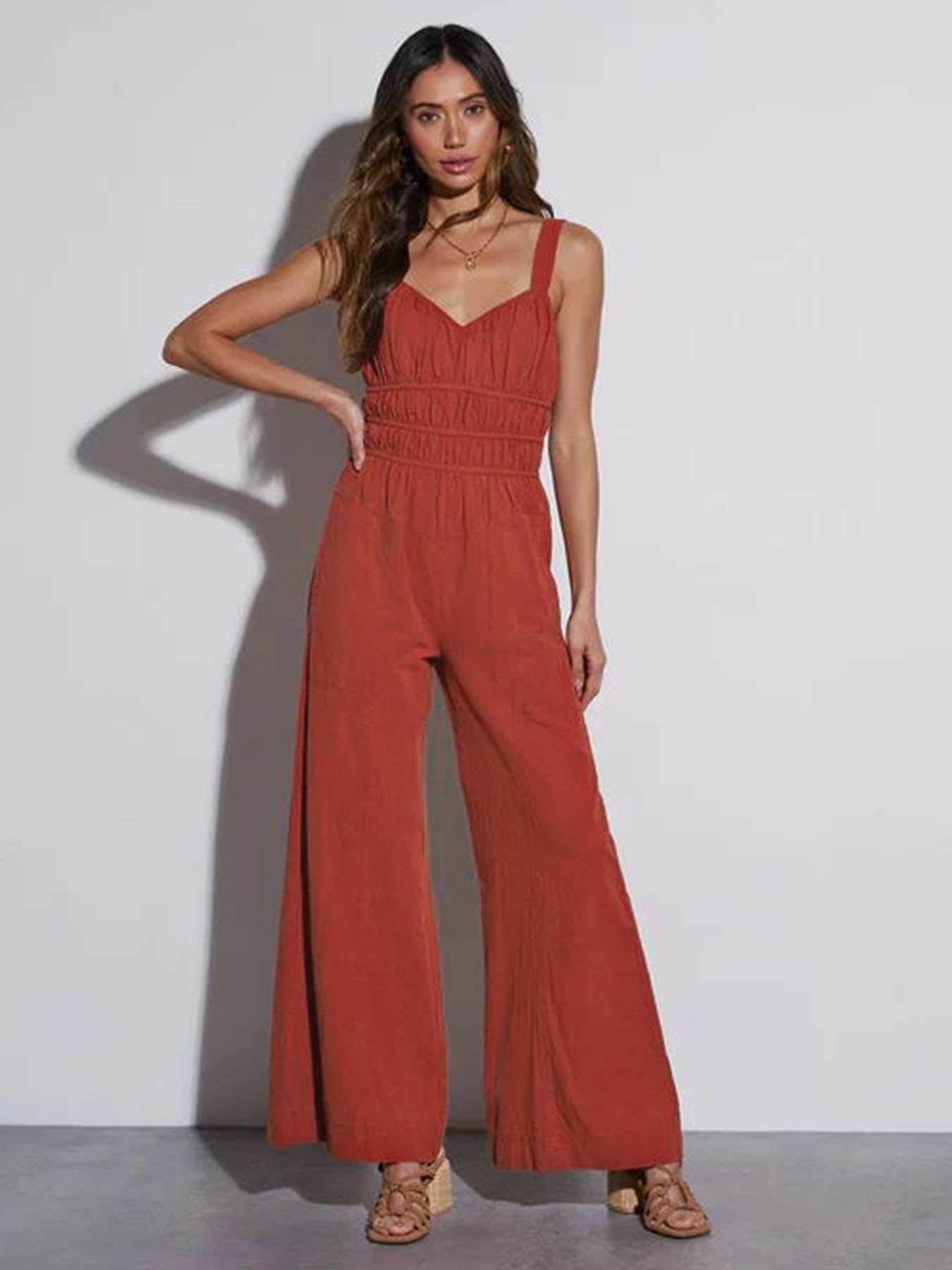 - Feature:Sweetheart neckline. Shoulder Straps. Wide-leg fit. Ruched waist & bust. Side pocketed. Back tie closure. Relaxed fit.