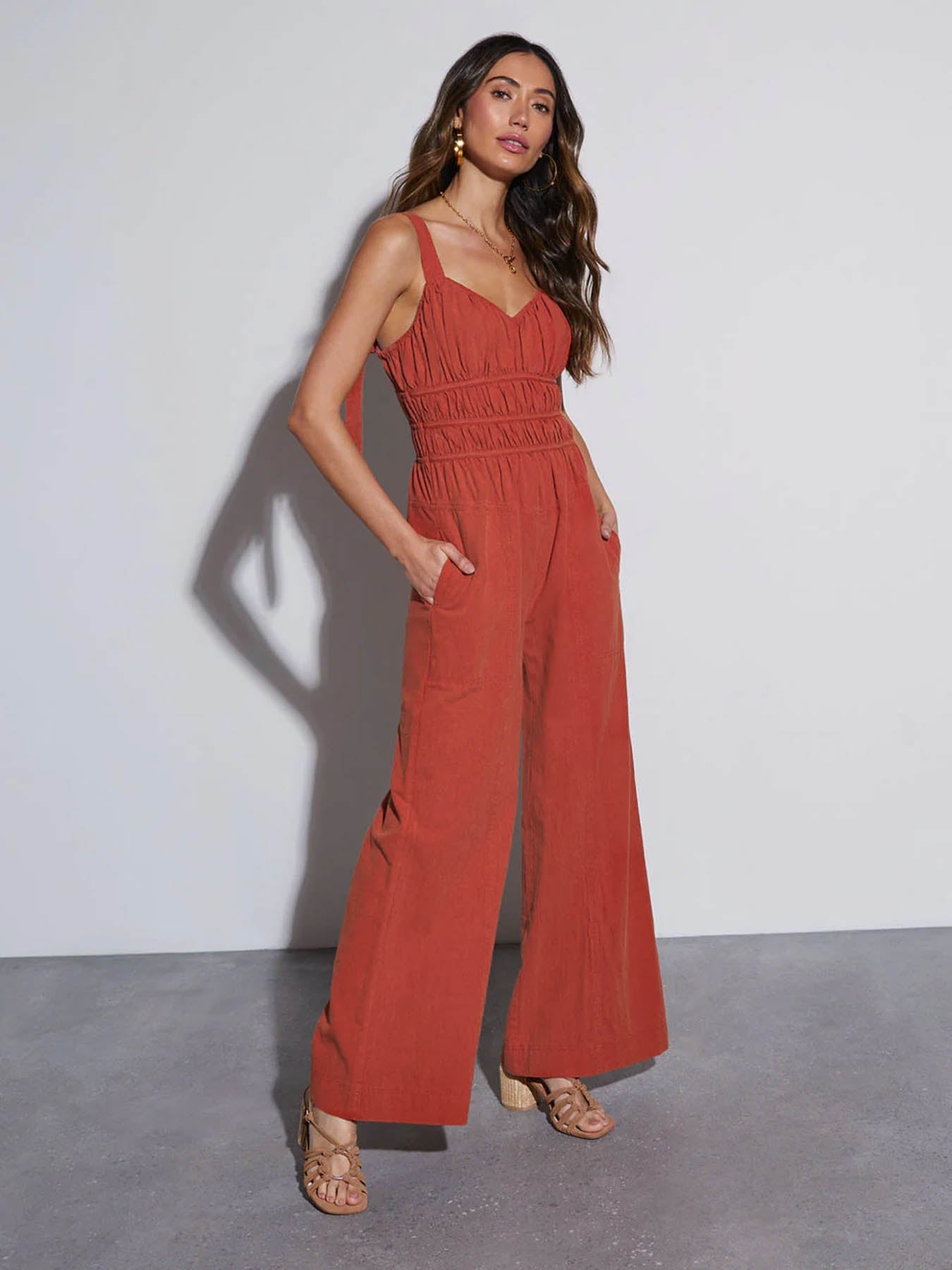 Get ready to slay in style with the Sloane Ruched Pocketed Jumpsuit. This one-and-done outfit features a flattering ruched design and convenient pockets, perfect for a night out or a casual day out. No need to fuss over what to wear, this jumpsuit has got you covered (literally and figuratively) with effortless style.