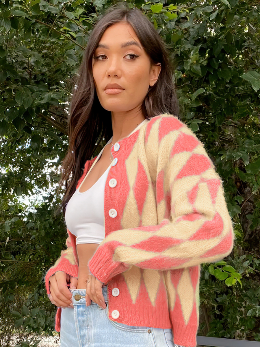 Calistally Doll | FELISE Chess Patterned Knit Cardigan - Orange