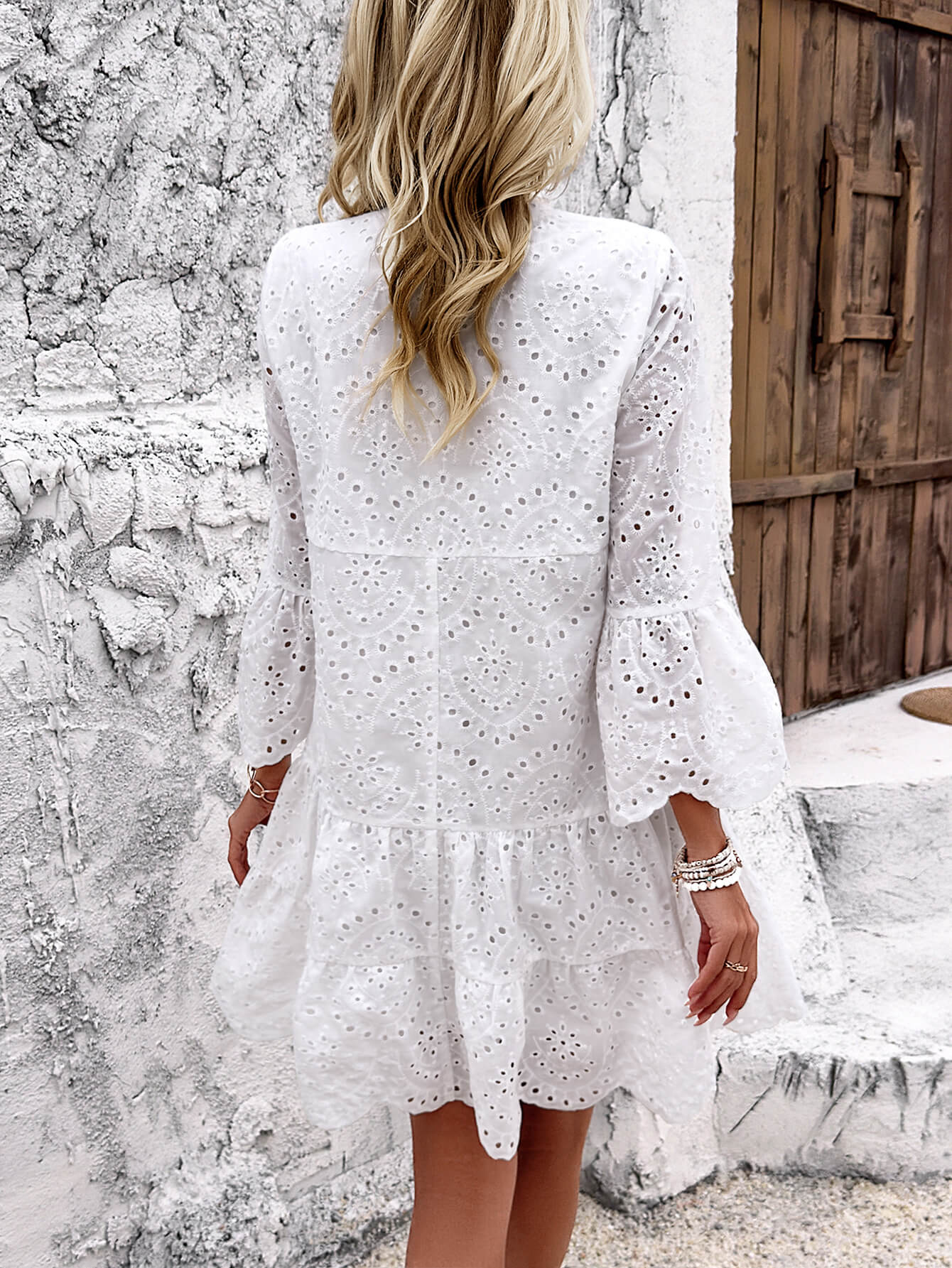 - Feature: Stand collar. Long Sleeves. Scallop cuff. Eyelet Lace Fabrication. Front button closures. Flowy Dress. Mini length.