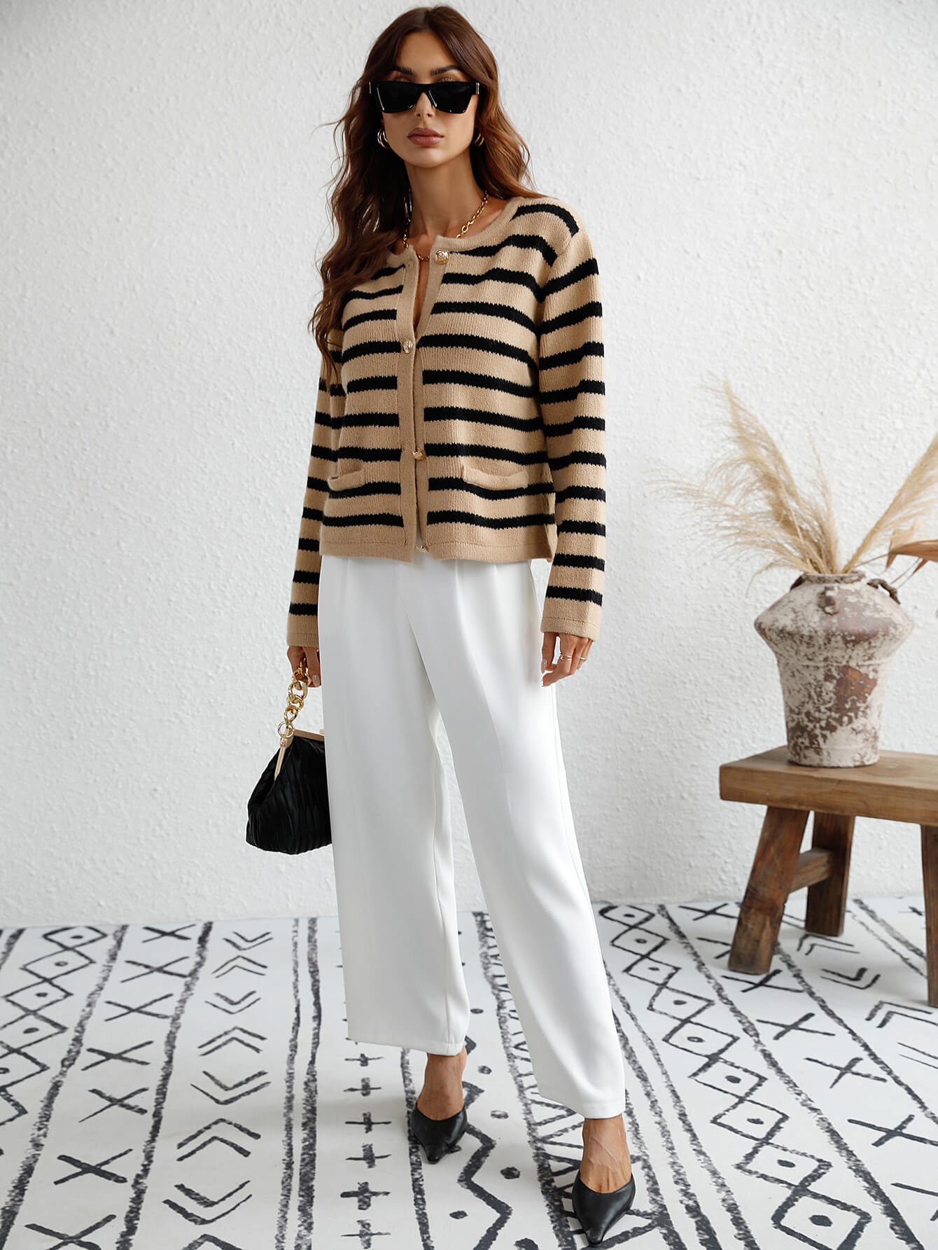 STRIPE POCKET BUTTON UP KNIT CARDIGAN - BEIGE