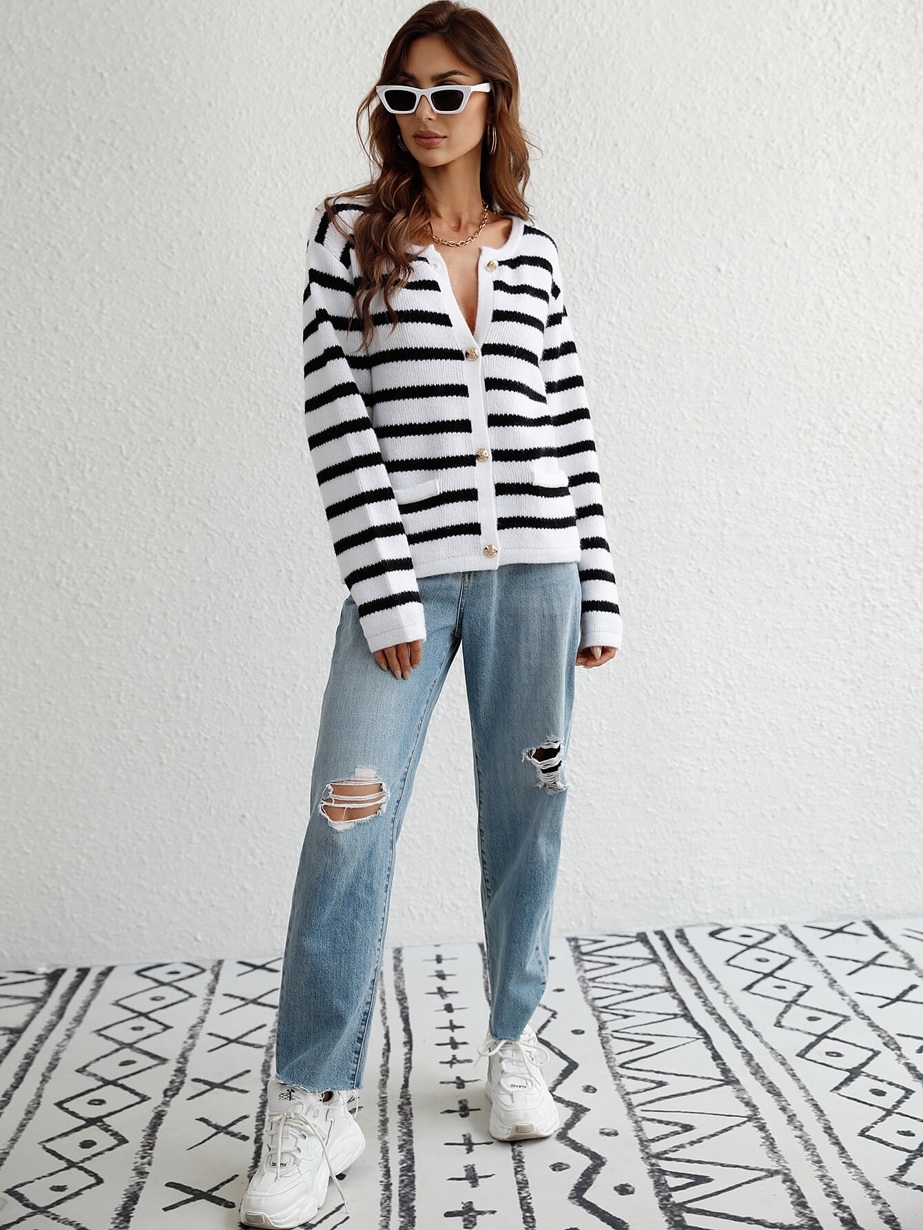 STRIPE POCKET BUTTON UP KNIT CARDIGAN - WHITE