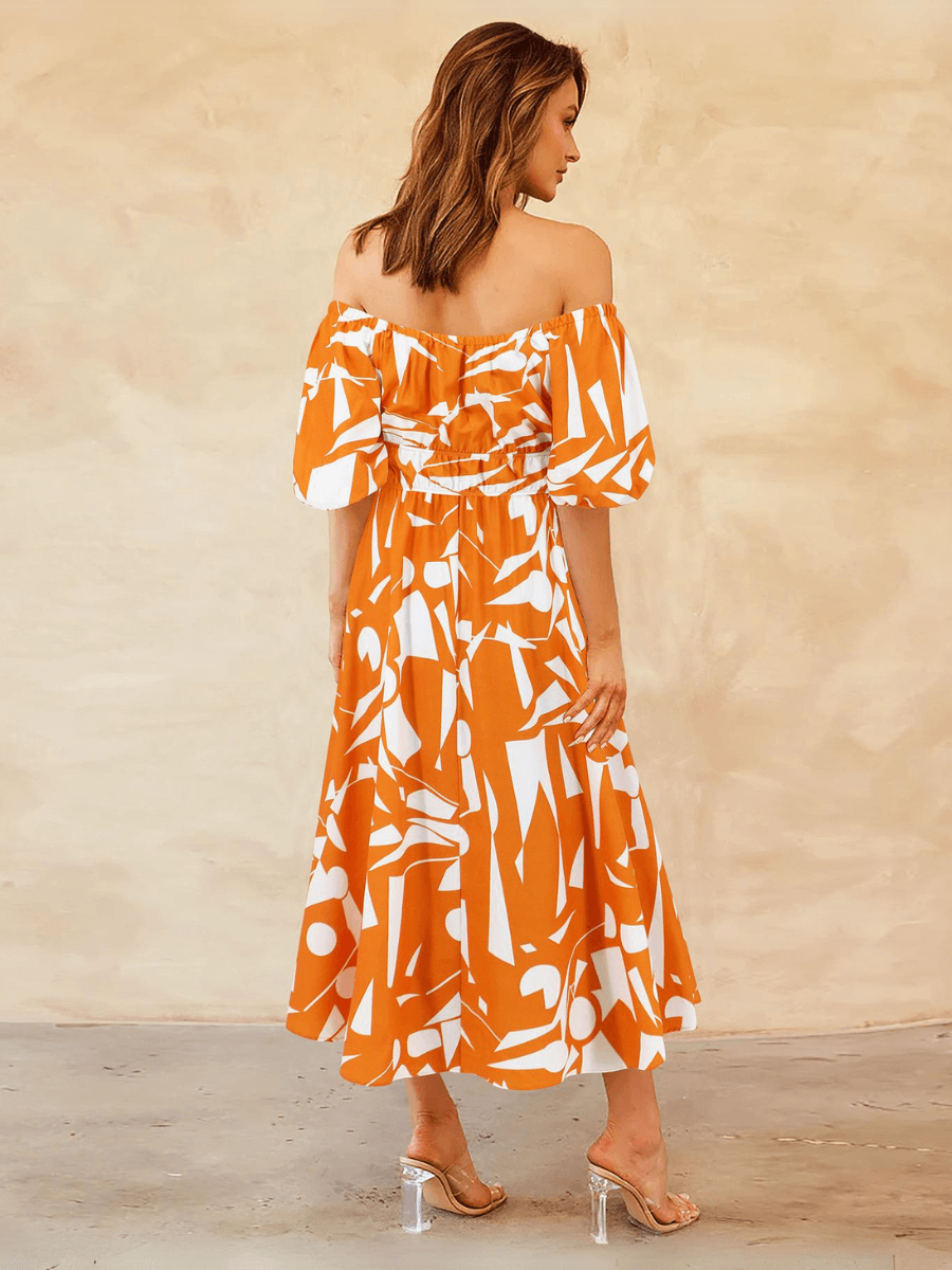 - Feature: Off-the shoulder. Midi length. Short Puff Sleeves. Abstract prints. Relax fit. Not lined.