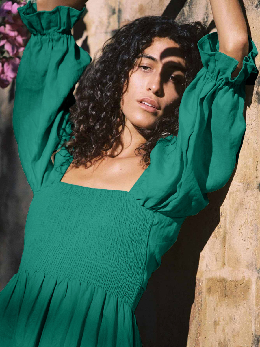 - Feature: Mini length.Puffsleeves. Smocked Bodice. Two Tiered Way.