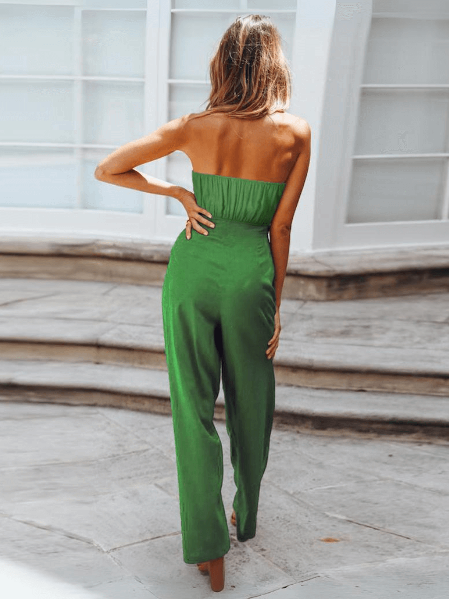 Elevate your style with the Tammy Jumpsuit. The strapless design and waist tie front accentuate your features, while the vibrant green color adds a pop of color to any outfit. Show off your personality and fashion sense with this unique and versatile piece.