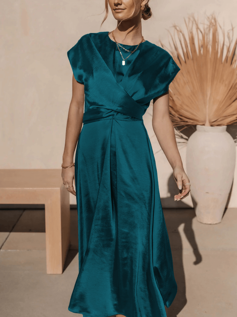 Theia Satin Short Sleeve Midi Dress - Teal