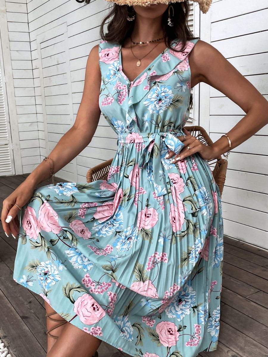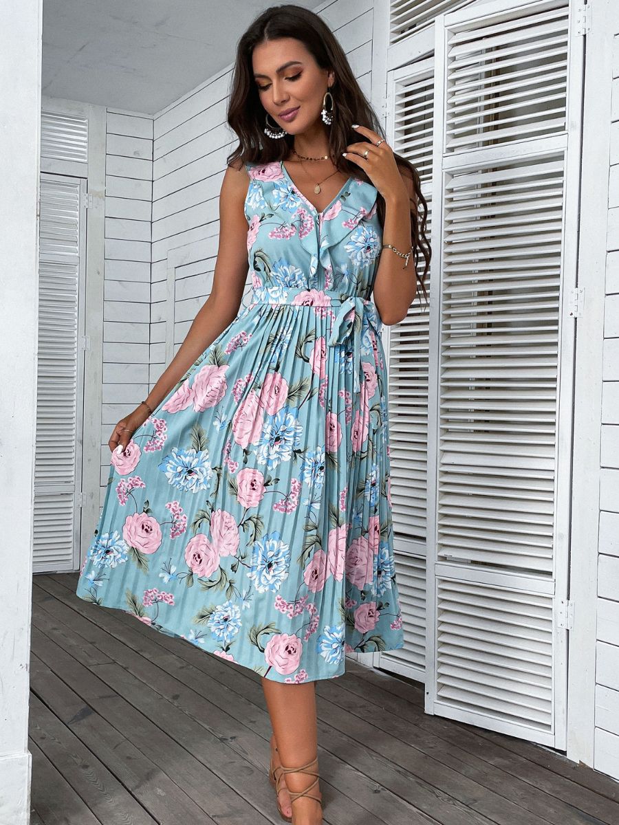 Our Uke Dress comes a light blue tonefeaturing beautiful pink, blue, white & greenroseprints. This midi is a relaxed fit featuring sleeveless. The frill hemline is the perfect dash of femininity to this number!