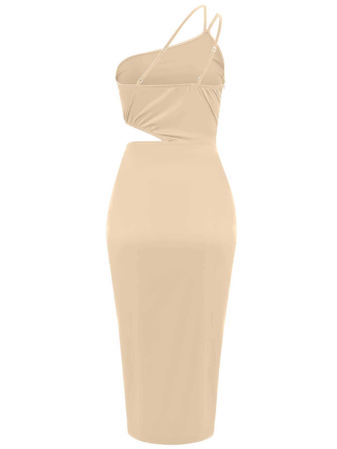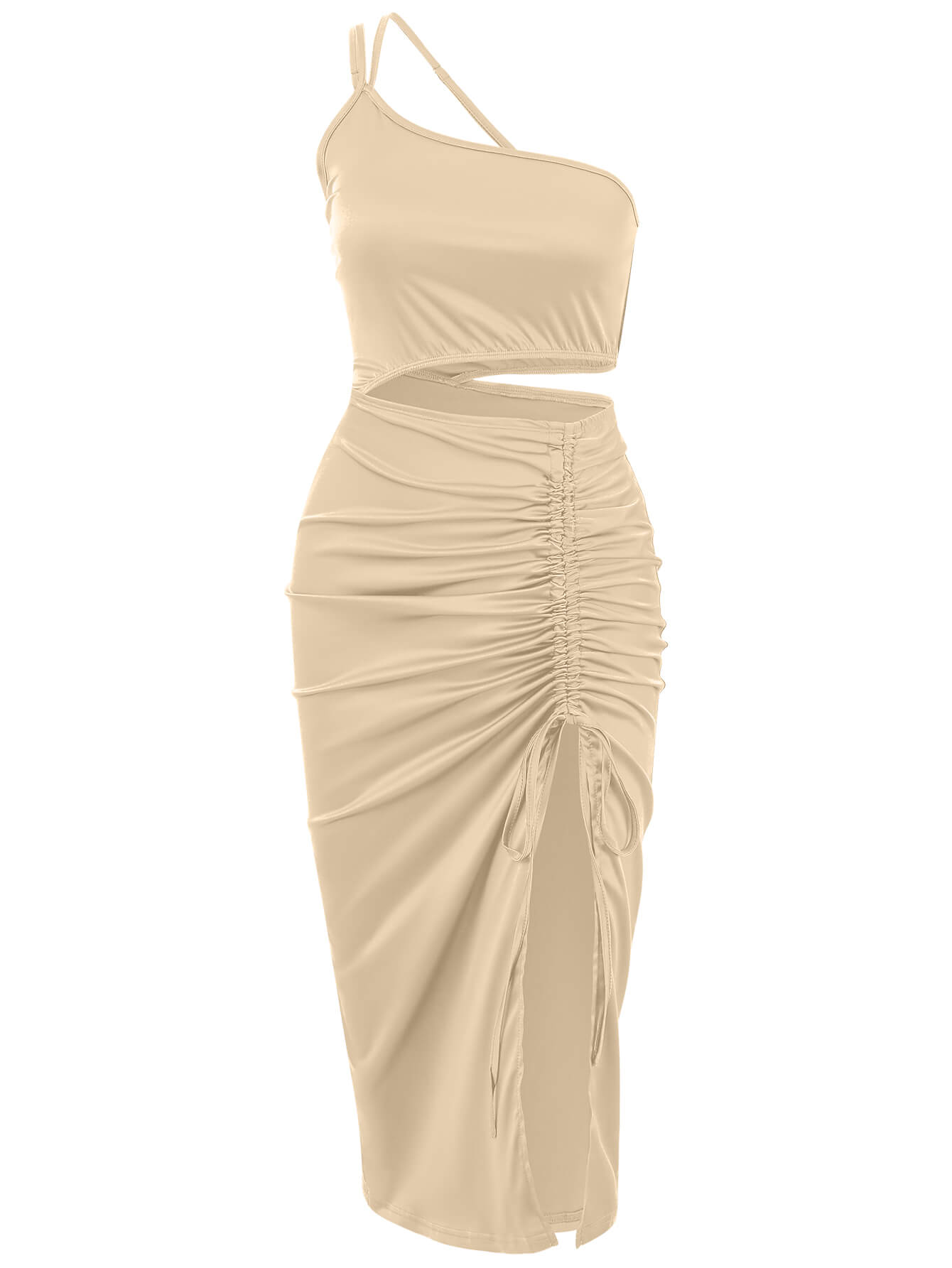 - Feature: One-shoulder. Sleeveless. Cut-out waist. Thigh ruched slit. Satin fabrication. Midi length.