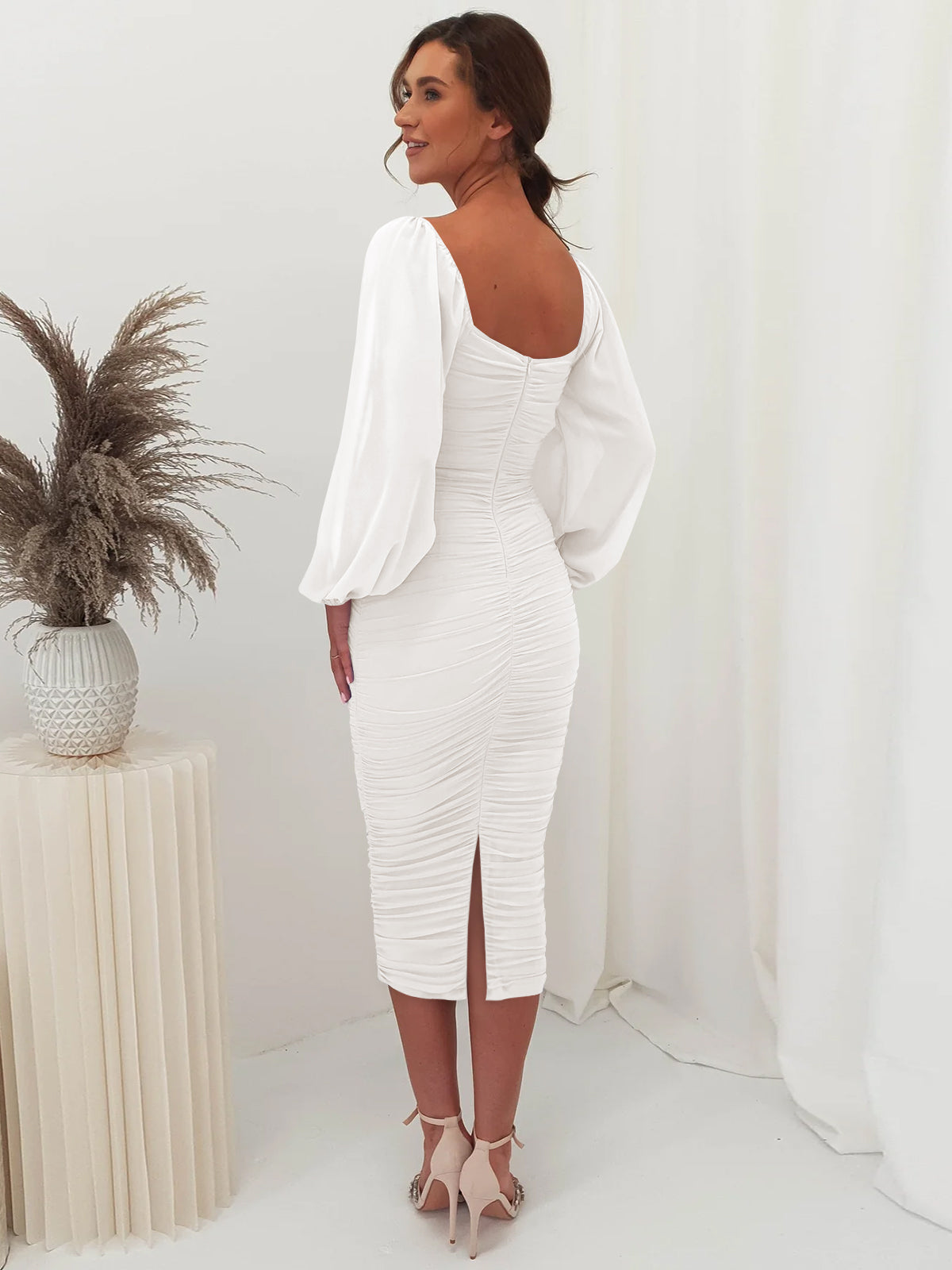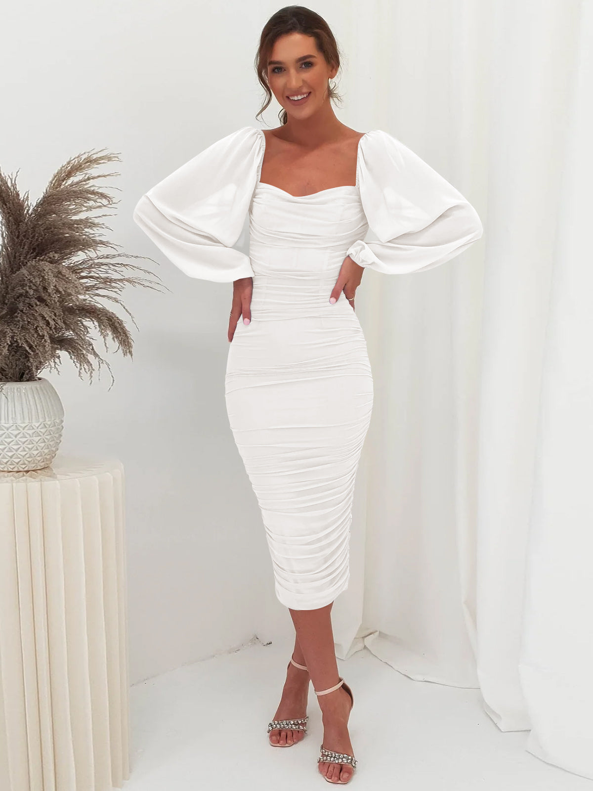 - Feature:Square Neckline. Long Sleeve. Ruched. Lined. Bodycon Fit. MidiLength.