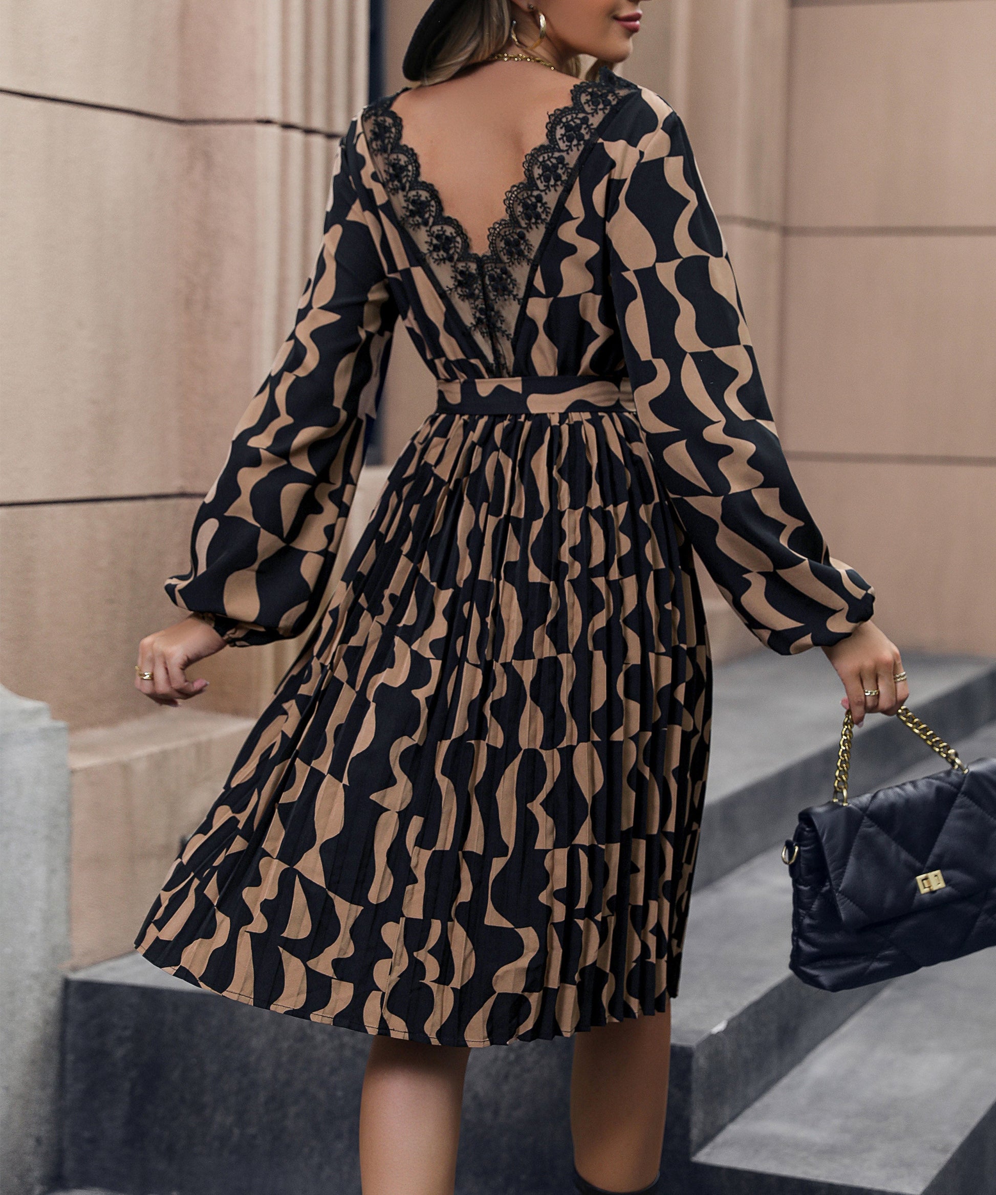 - Feature: V neckline. Long puffy sleeves. Midi length with waist tie. Invisible zipclosure. Relax Fit.